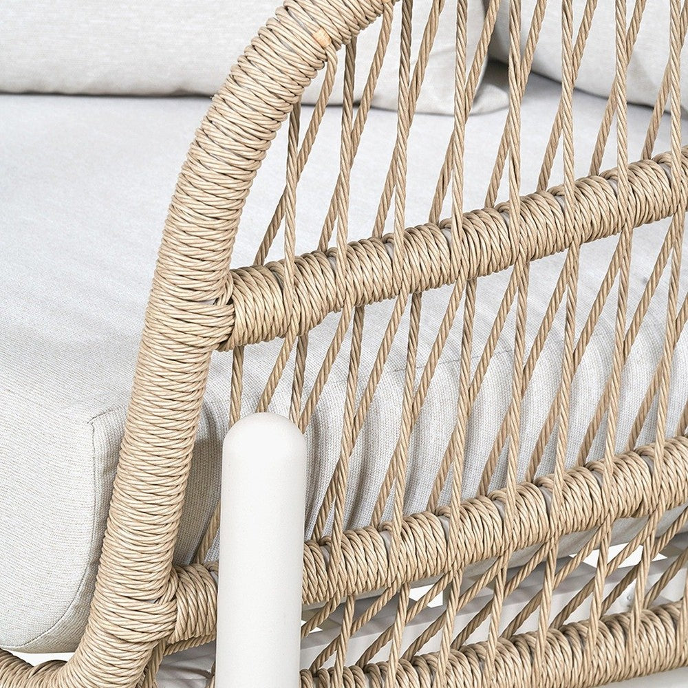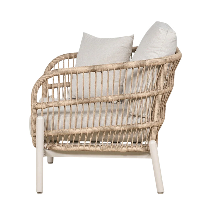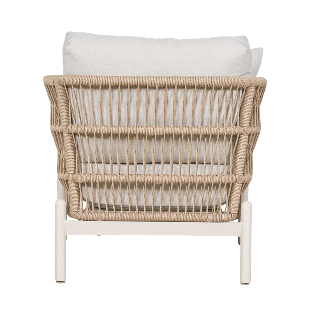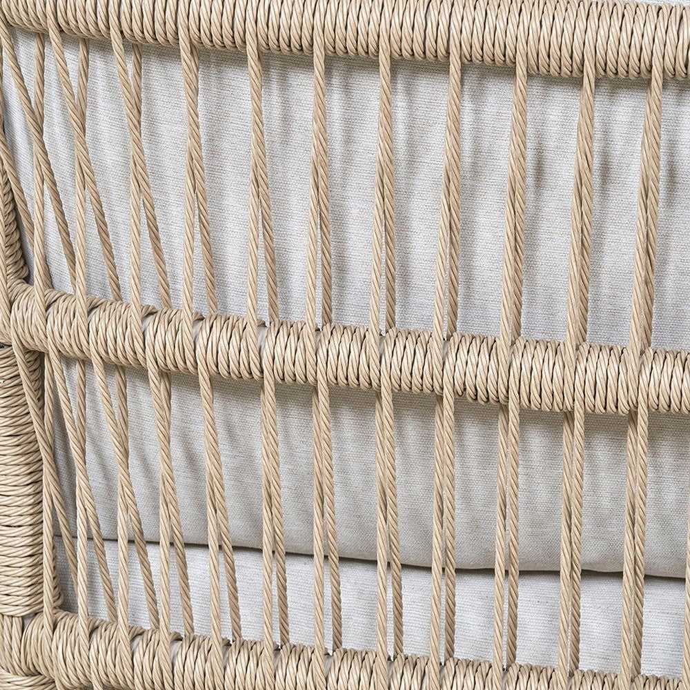 The contemporary Maria Outdoor Armchair is designed to offer the ultimate lounging experience. You can buy this piece in multiples and pair it with your choice of side or coffee tables to create a bespoke bistro setup tailored to your outdoor space. This Armchair features a Natural Synthetic Core Weave and a durable, Latte-coloured, powder-coated aluminium frame. It’s complemented by seat and back cushions in Light Putty Olefin fabric, a popular choice in outdoor furniture for its synthetic fibres that resist staining, fade, and dry quickly, making it ideal for outdoor use. This set is elevated with additional scatters for enhanced comfort.