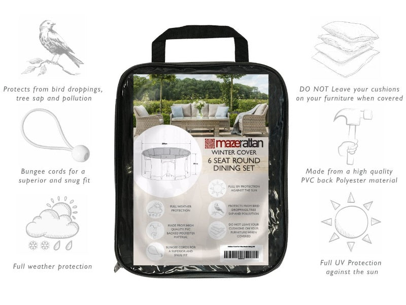The Winter Cover for our 6 Seat Round Dining Sets is the ideal winter protection for your garden furniture. Manufactured from our premium breathable fabric, we can guarantee our covers will provide superior protection from the elements. All of our furniture covers are packed with cord strings. To secure your cover simply thread the cord strings through the eyelets and loop back round the feet of your furniture. Please note all furniture cushions should not be stored underneath any of our covers. We recommend you keep your cushions stored in a dry location.