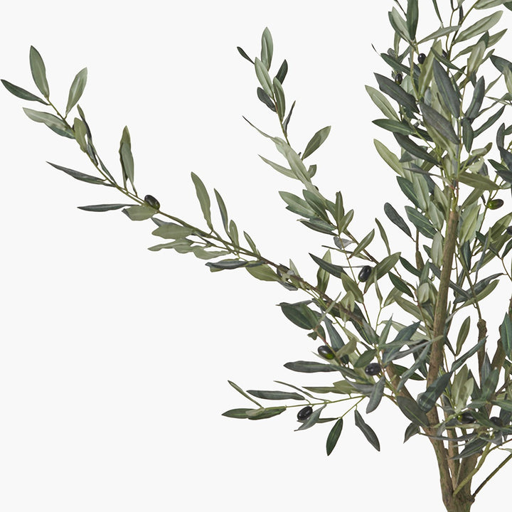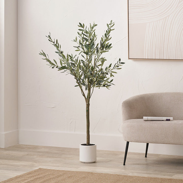 Elevate your home with our faux potted olive tree, reminiscent of the Mediterranean. The well proprtioned and incredibly stylish tree, in a white polypropylene pot will bring a touch of tactility to any living space. Perfect for your living room or entrance hall, with no maintenance needed, it promises lasting style.