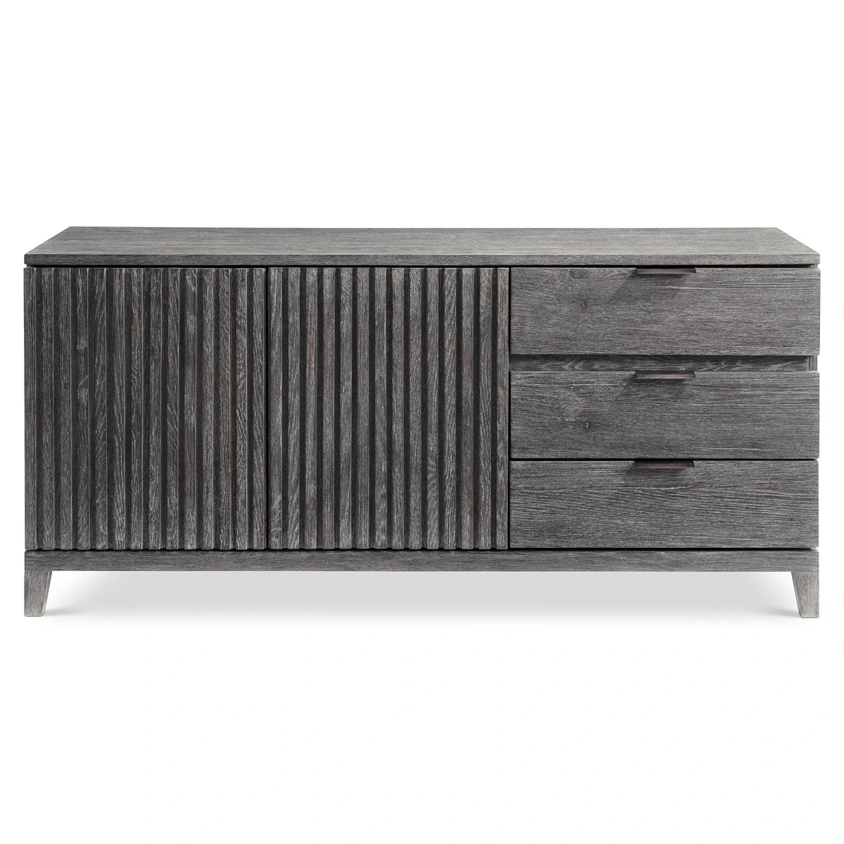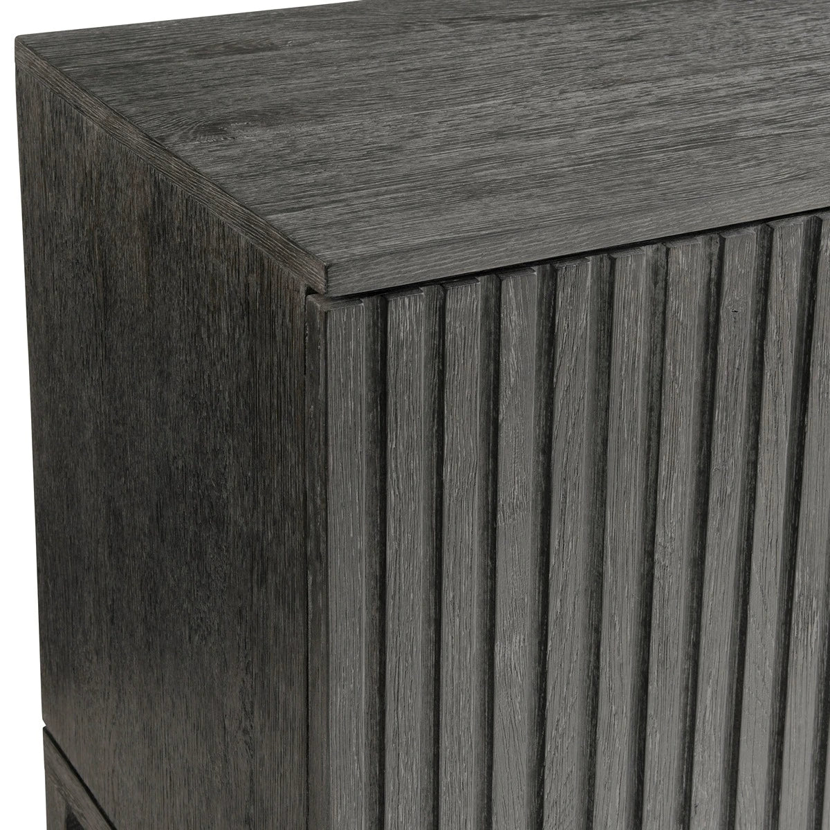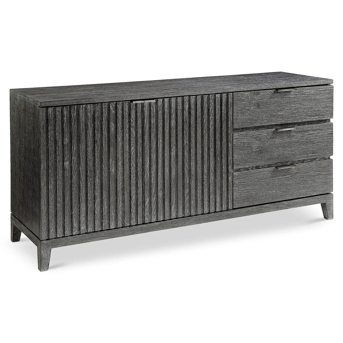 A modern perspective is redefined in a moody palette for the Menton buffet. Perfectly balancing beauty and function, the design offers two deeply reeded doors and three pull-to-open drawers with cast aluminum pulls. Interior storage includes two adjustable shelves.