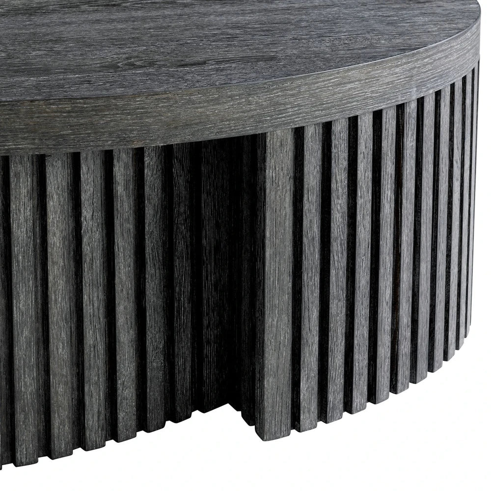 A moody, dark finish and architectural inspiration give the Menton cocktail table its distinct design. The base wraps around like a ribbon crafted of linear reeding. It supports an oval top that showcases the wood’s natural grain through the deep Sutton finish.