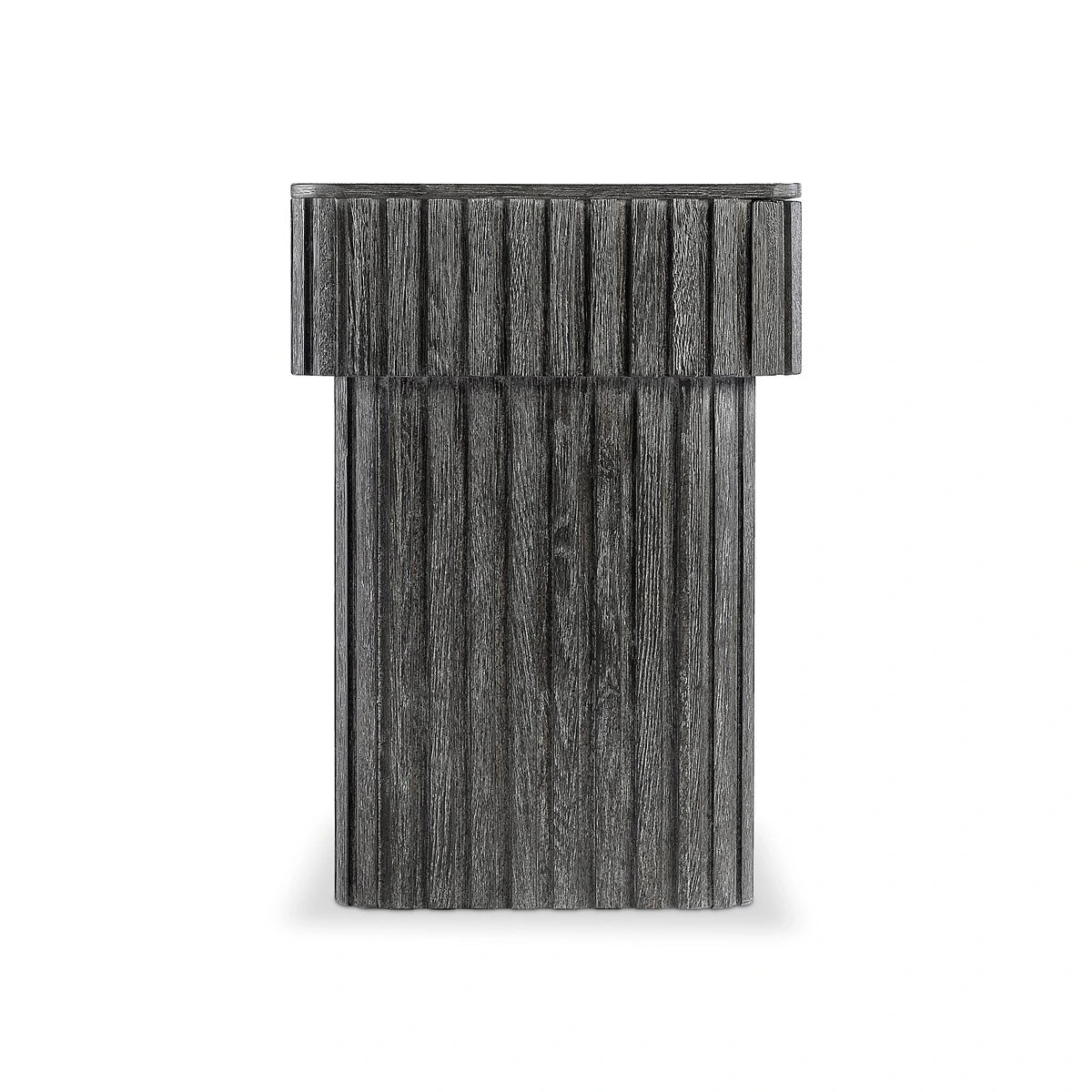 Inspired by architectural design, the Menton nightstand features deep linear reeding around the base and the sides of the top, with a smooth table surface. A hidden pull-to-open drawer is accessed with a finger pull. The deeply textured woodgrain is highlighted with the Sutton finish.