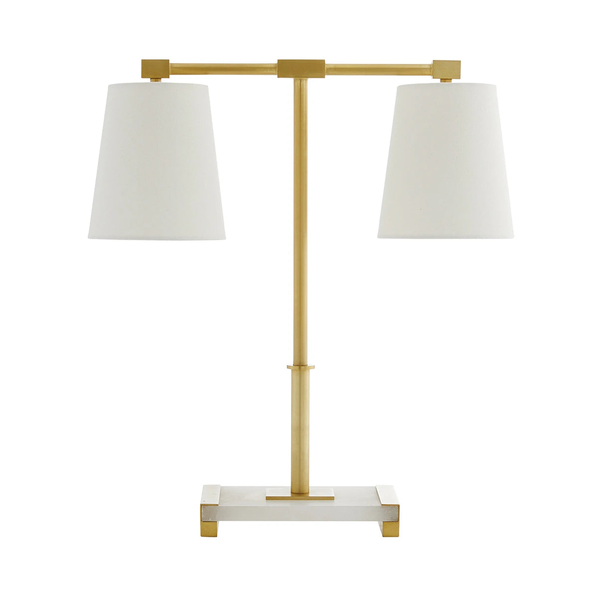 Inset in a matching antique brass steel frame for a more cohesive look. The classic library silhouette of the messina provides a beautiful balance to any tabletop. A slender, double-arm frame of antique brass steel presents two tapered, off-white linen shades with an off-white cotton lining. The white alabaster base is inset and the finish will vary.