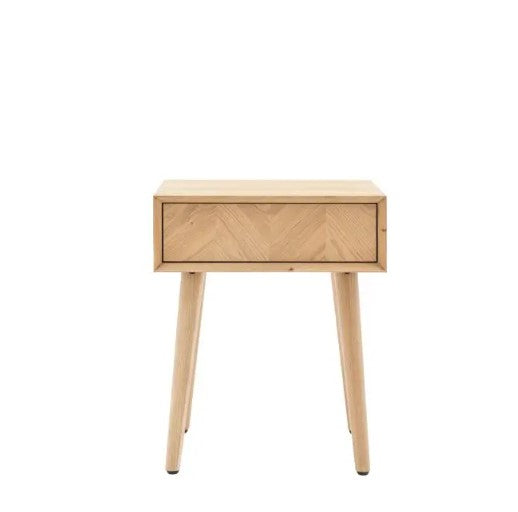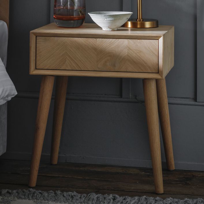 This stunning 1 drawer side table features a beautiful inlay chevron design, and is made using European oak and rustic oak structured veneers which show the natural beauty of the oak grain and knots. Finished in a specialist mat lacquer, which keeps the timber looking natural and dry, with brushed out grain, the table is tactile to the touch and looks amazing. It features a drawer for added practicality. The table is also great as a bedside, especially when paired with a coordinating headboard.