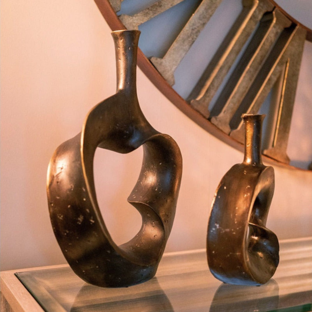 A beautiful dark-toned abstract vase, with naturally occurring indentations and blonde sculptural highlights. Its organic form adds a contemporary style to your home, making it a must-have for modern decor lovers. Colour Scheme: Dark tones, blonde highlights. Styling Tip: Ideal for modern shelf or console styling in pairs with its matching Small Abstract Vase (SDA038) or individually. Perfect for adding depth and texture to neutral or minimalist spaces.