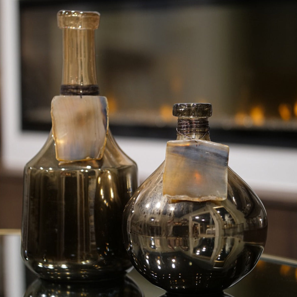 A beautiful glazed long-necked decorative bottle with antiqued gold and amber tones, finished with a striking statement medallion. This piece effortlessly combines timeless elegance with a touch of modern charm, making it the perfect styling accessory for any room in your home. Whether styled on a shelf, console, or mantel, the Alvar Bottle is sure to elevate your decor with its unique character. Colour Scheme: Amber, antiqued gold. Styling Tip: Pair this bottle with earthy tones and natural textures like wooden trays or ceramic decor for a warm, cohesive look. It also complements metallic accents and greenery for a vibrant yet sophisticated style. Perfect for placing alongside a stack of books or framed art to create a balanced, eye-catching display.