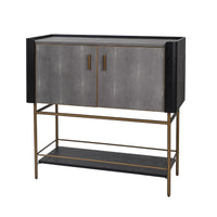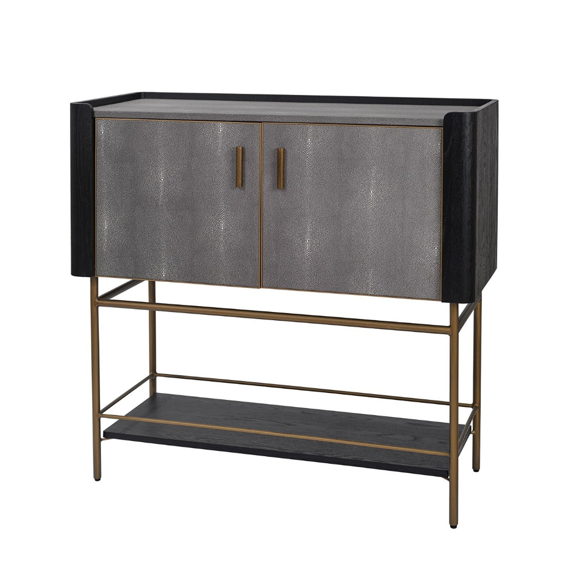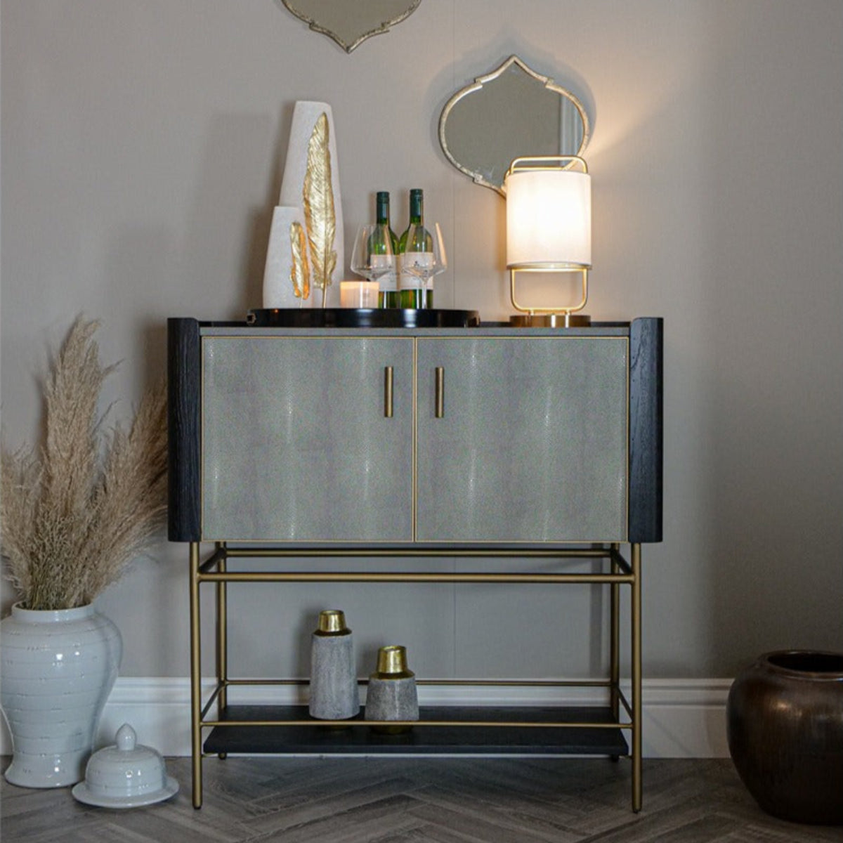 Discover the art of entertaining with the Limoges Bar Cabinet Chest. This showstopping drinks cabinet features an exquisite faux shagreen finish, combining exotic elegance with modern design. The soft grey/black leatherette is surrounded by rich textured charcoal black oak wood and is equipped with suitable storage for your glamorous glassware and tempting tipples. It also features a luxurious velvet backing. Colour Scheme: Grey/black and charcoal oak. Styling Tip: Place this bar cabinet in your living room or dining area, and fill it with your favorite spirits and glassware. Decorate the top with stylish bar accessories for a sophisticated entertaining space.