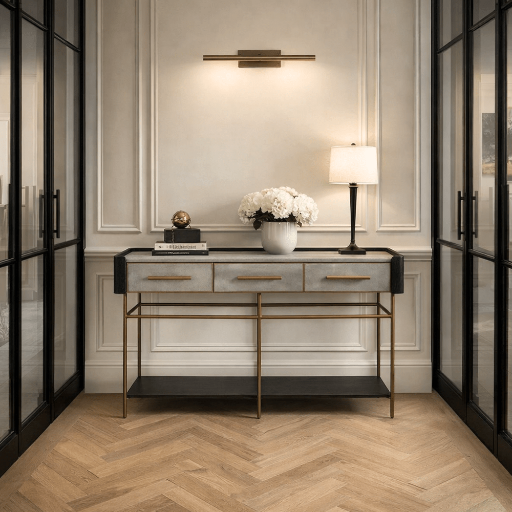 The Limoges Console Table is a stunning contemporary piece that embodies luxurious design. Featuring an exquisite faux shagreen finish, this table adds a sophisticated touch to any space. The soft grey/black leatherette is beautifully complemented by a rich textured charcoal black oak wood frame. Colour Scheme: Grey/black and charcoal oak. Styling Tip: Use this console table in an entryway or living room. Top it with a decorative mirror and stylish accessories to create an inviting focal point.