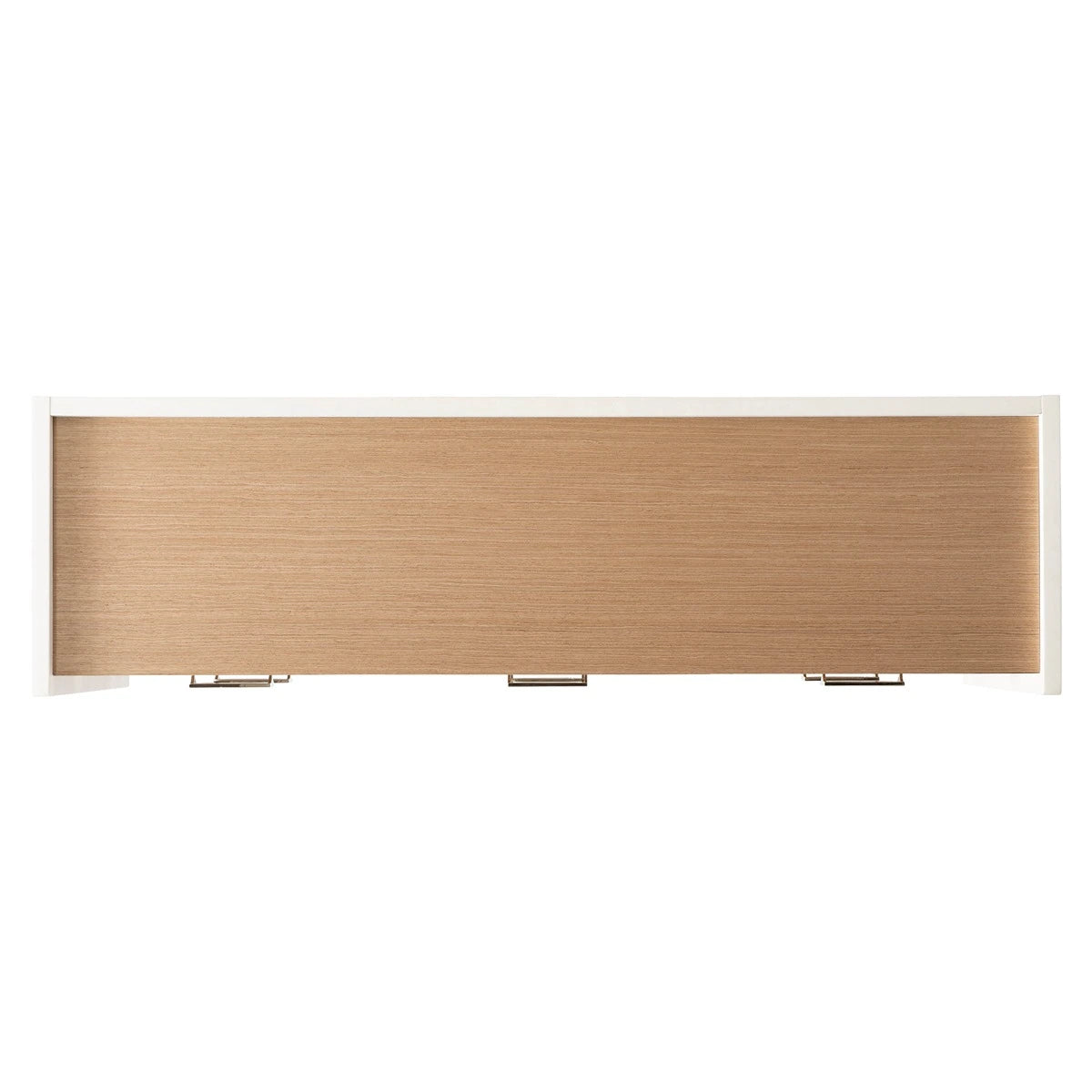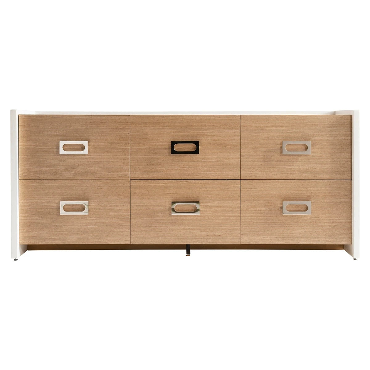 With its design inspired by midcentury modern styles, the Modulum dresser is finished in Sahara with a center case that floats between white Adobe side panels. A gallery rail around the top is also finished in Adobe. Six soft-close drawers are highlighted with metal hardware that has a distinctly retro design.