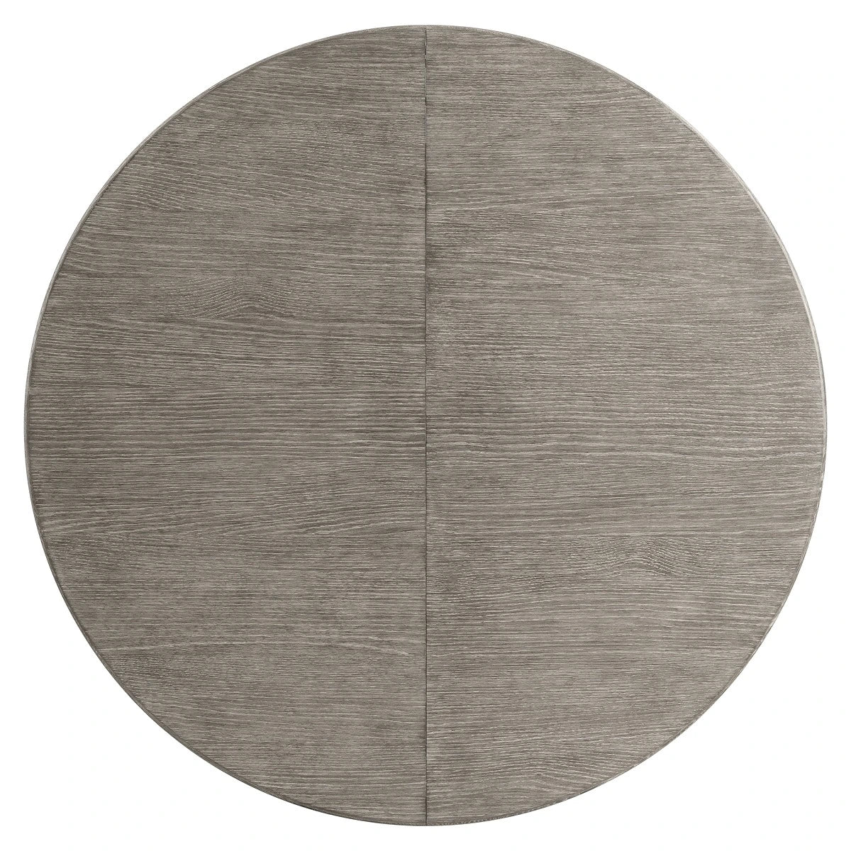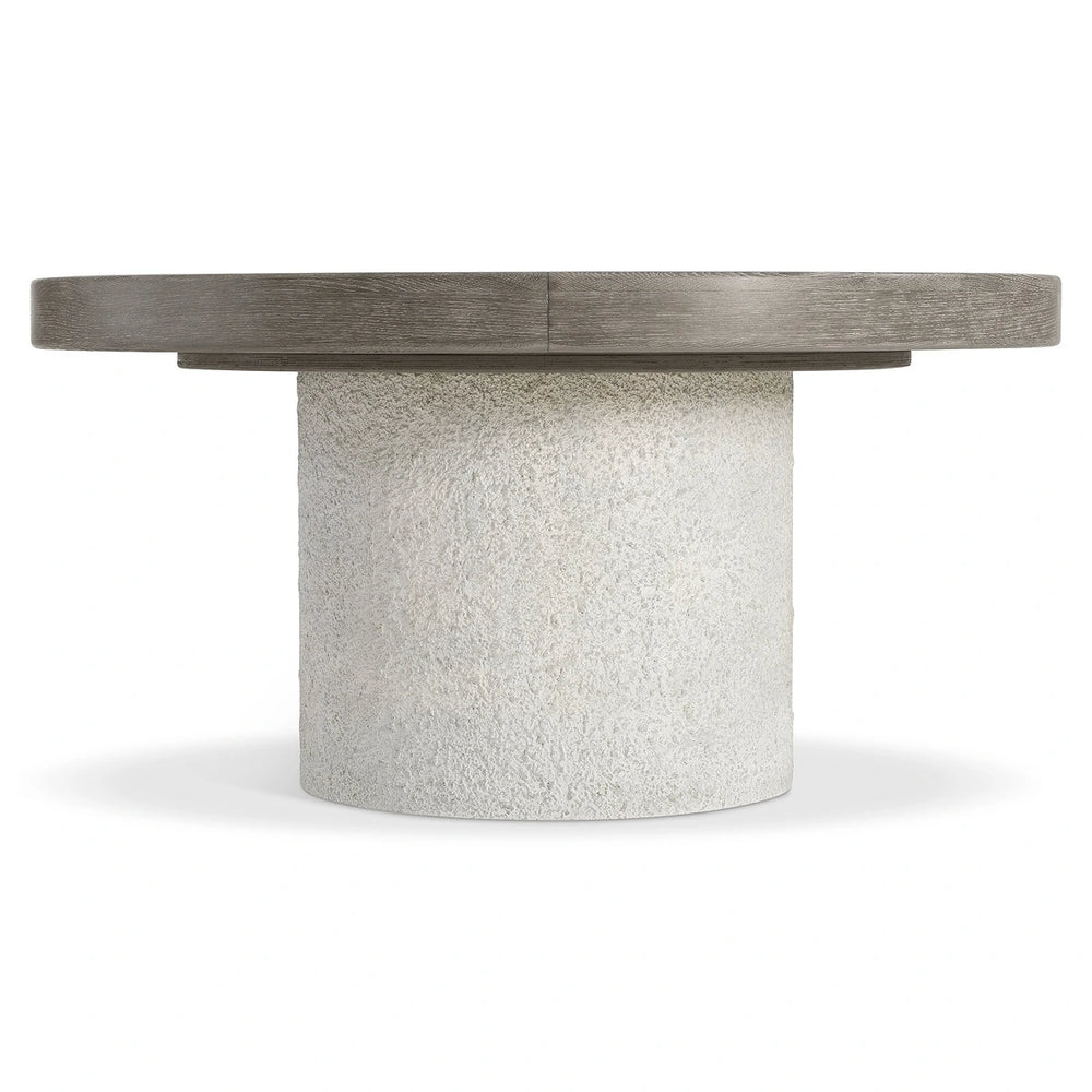 Simple forms are refashioned into an alluring design for the Monolith dining table. A circular faux stone pillar showcases beautiful texture in the Millstone finish. A round top in Puma-finished wood can be expanded to an oval shape with the addition of one leaf.