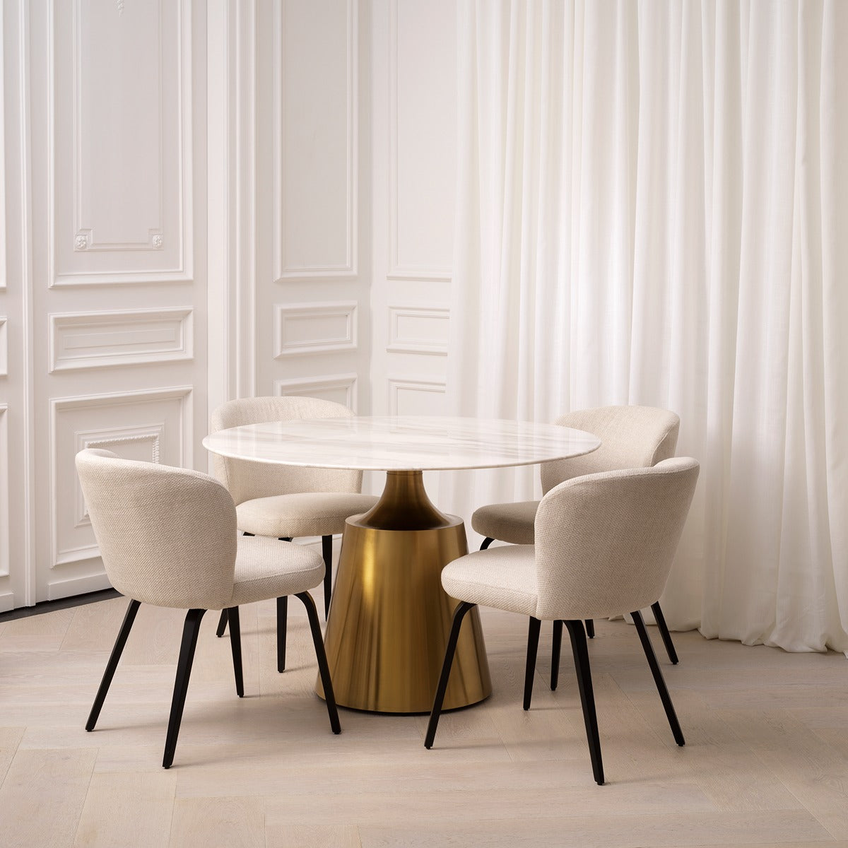 With its flawless round White Volakas marble top and distinct tapered brass base, the Dining Table Nathan perfectly encapsulates the very essence of sophisticated contemporary design. Simple, elegant lines allow the noble, luxurious material of the marble to take the entire spotlight. Decorate and enhance your high-end home with this truly elegant and iconic round piece for an undeniably distinguished, modern look that exudes curated luxury.