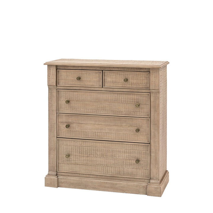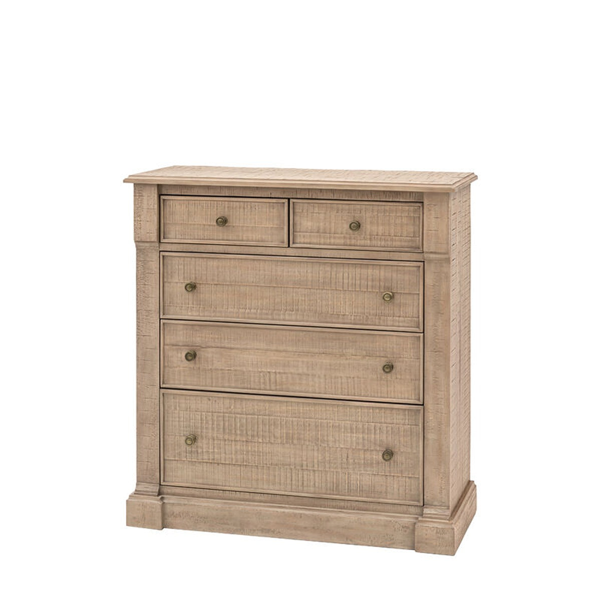 This 5 drawer chest is a charming and practical addition to any bedroom. Its weathered wood finish and simple design create a warm and inviting atmosphere. The five drawers provide ample storage space for clothing, linens, and other essentials. Perfect for adding a touch of rustic charm to your space.
