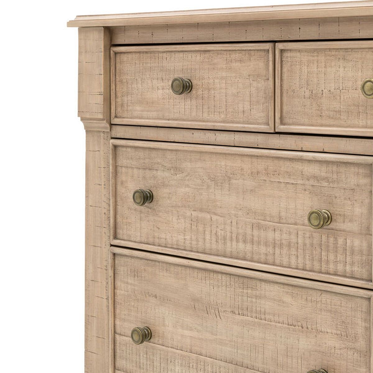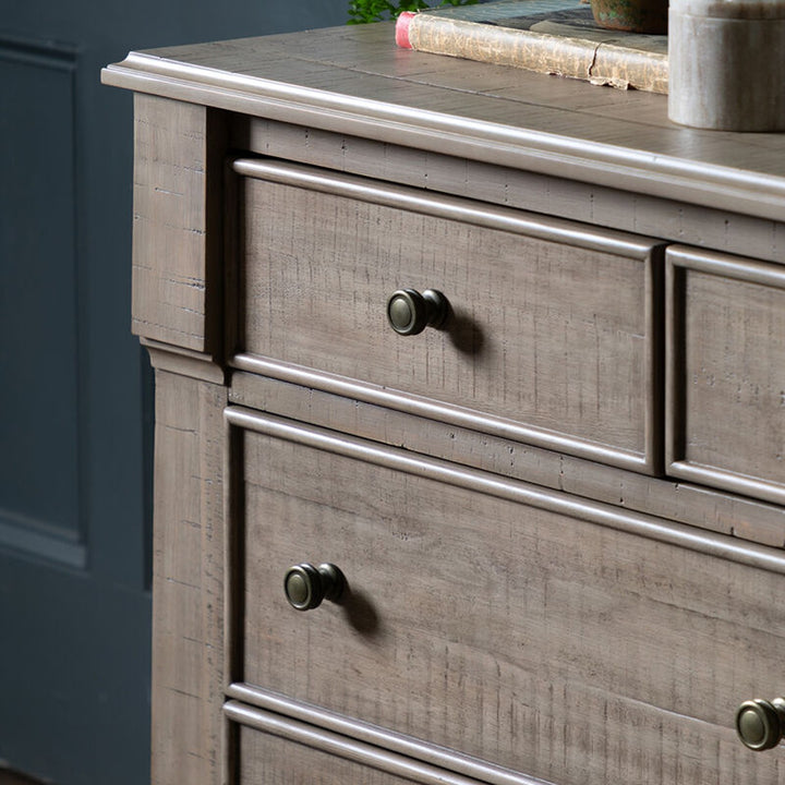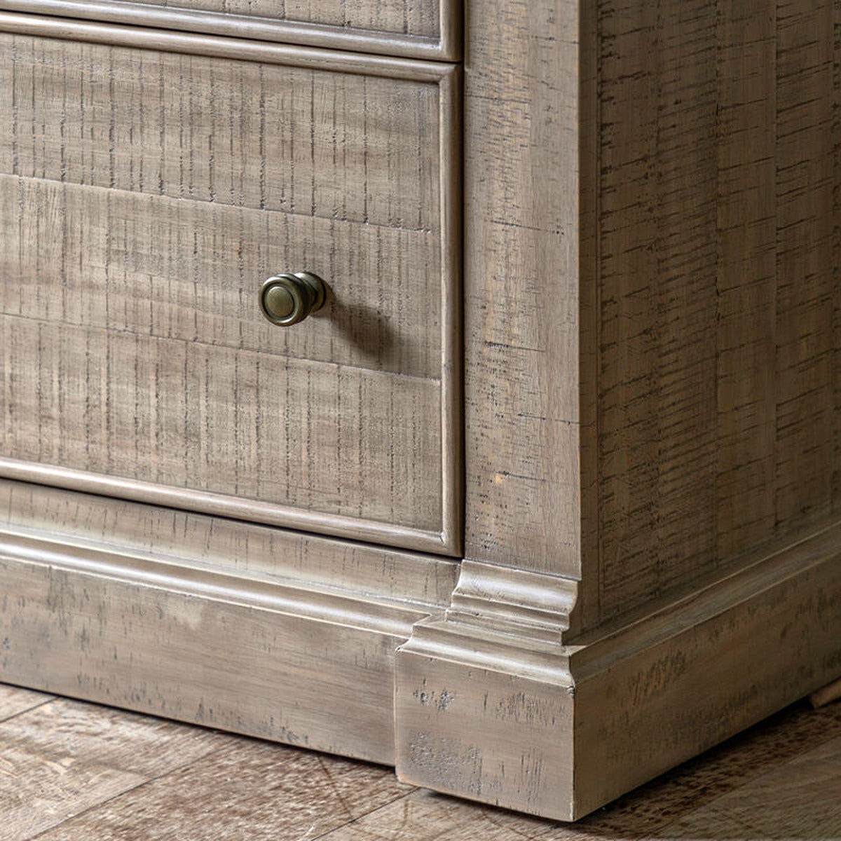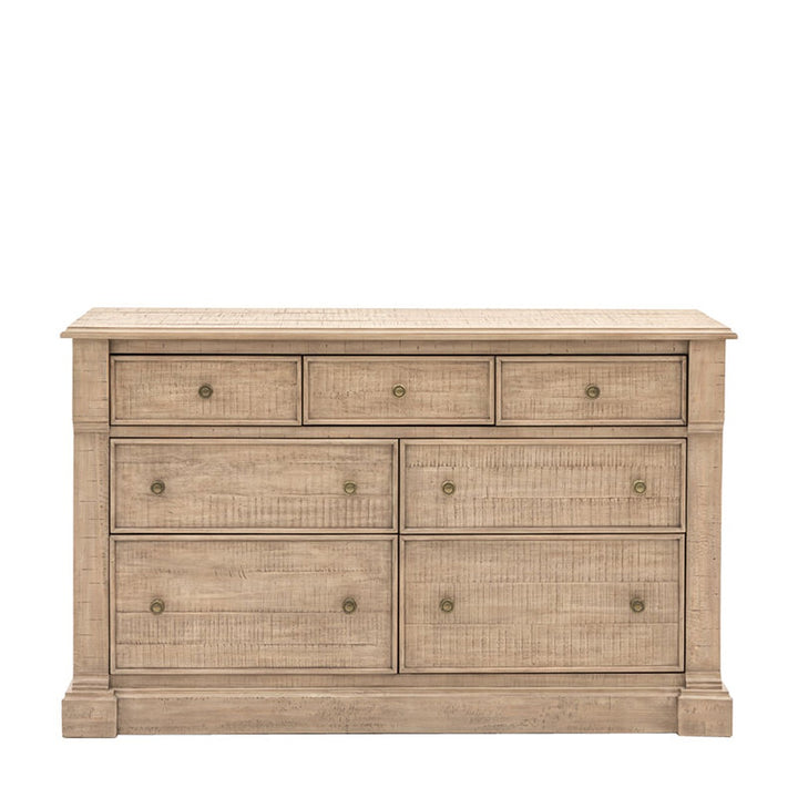 This 7 drawer chest is a charming and practical addition to any bedroom. Its weathered wood finish and classic design create a warm and inviting atmosphere. The seven spacious drawers offer ample storage space for clothing, linens, and other essentials. The dresser's sturdy construction and timeless style make it a valuable addition to any home.