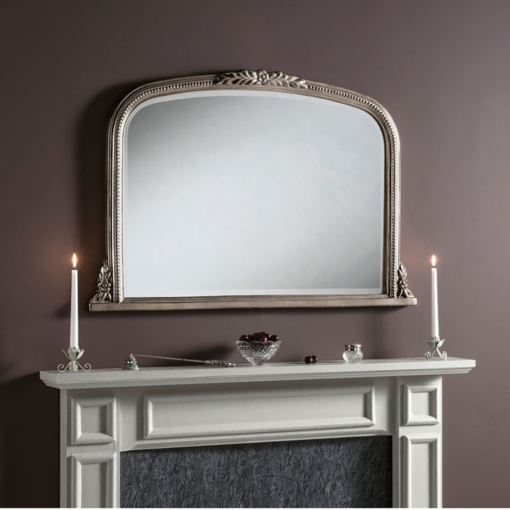 The wide frame features intricate floral designs at the top and bottom of each side, and a beaded arch runs over the entire frame. This wall mirror has been finished in a matt silver.