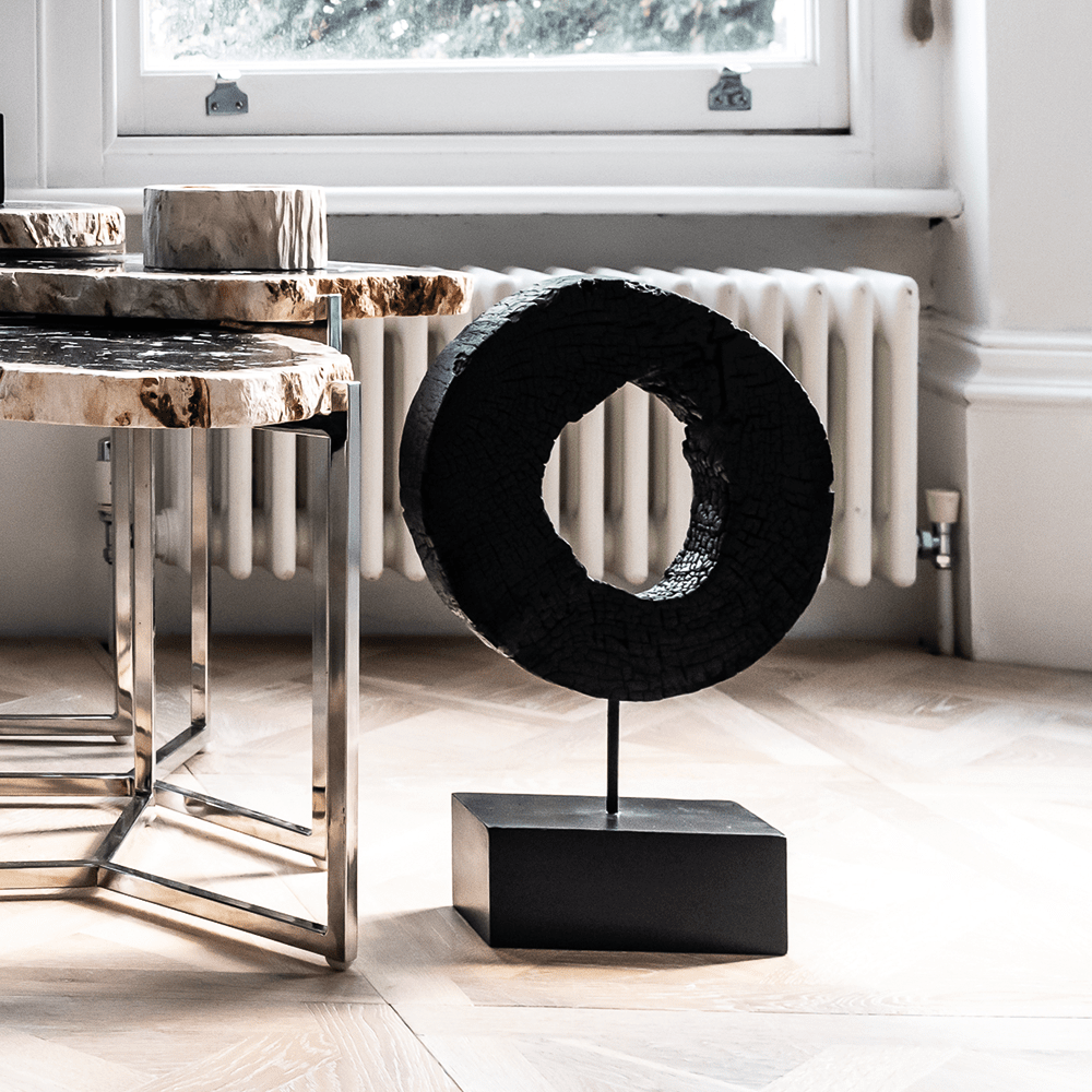 Adorn your abode with the influences of nature with this exquisitely beautiful black wooden sculpture from Olivia's. Carefully crafted from the finest mango wood, this large sculpture has an evocative charm of its own. The beautiful cross-sectional specimen of black mango wood is almost riven with the naturally varying ridges and textures that give it so much character.
