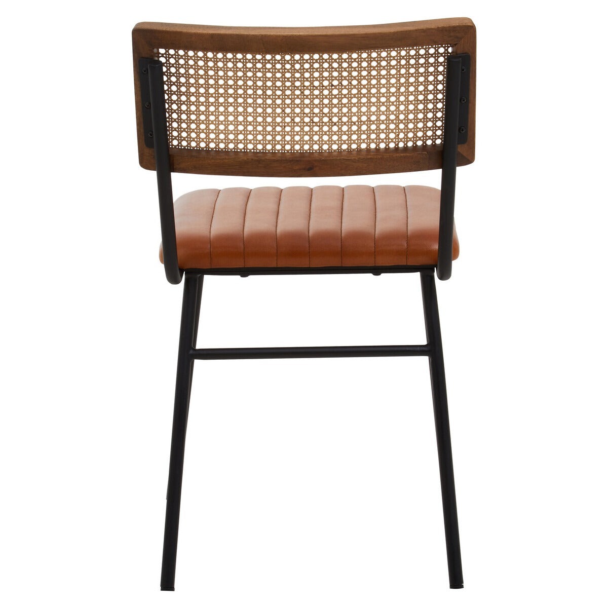This dining chair creates a stylish look with a mix of modern elements. The padded seat is upholstered in genuine tan leather, featuring channel tufting, which contrasts elegantly with the black iron legs.
