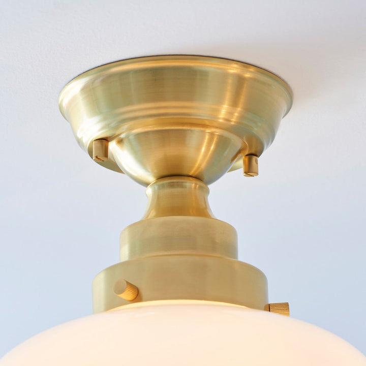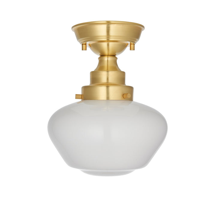 A timeless “school house” styled semi flush in brass with opal glass, ideal for the kitchen, above a breakfast bar or dining table. Hang individually or in a set of three. Matching pendant also available.