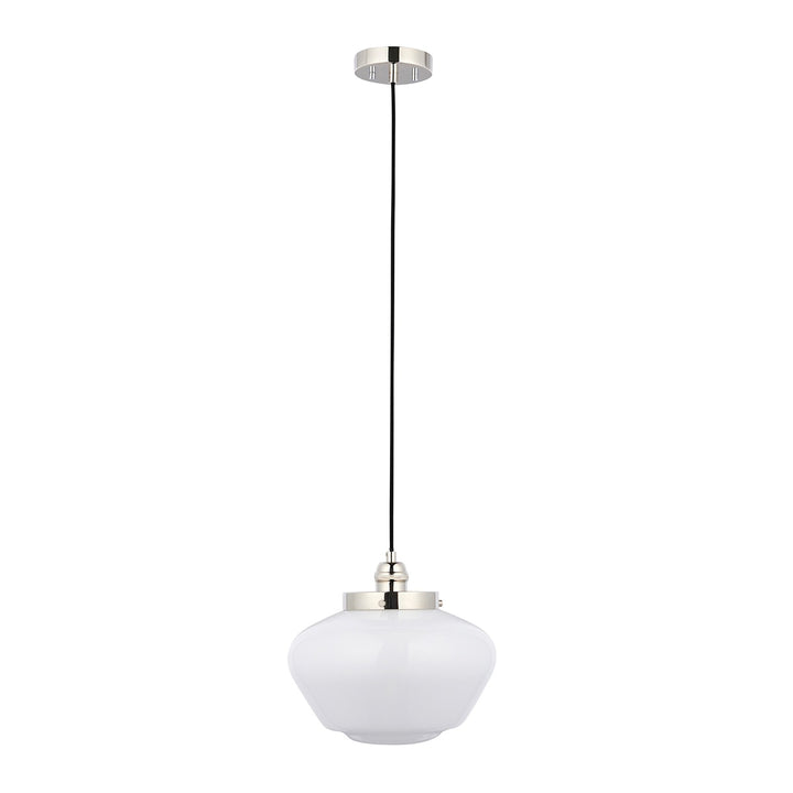 A timeless “school house” styled pendant in bright nickel with opal glass, ideal for the kitchen, above a breakfast bar or dining table. Hang individually or in a set of three. Matching semi flush also available.