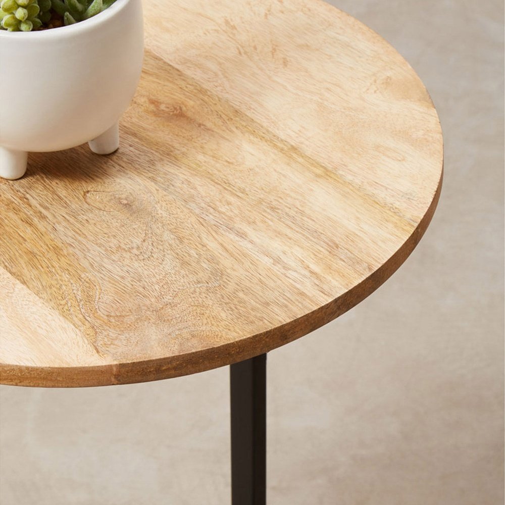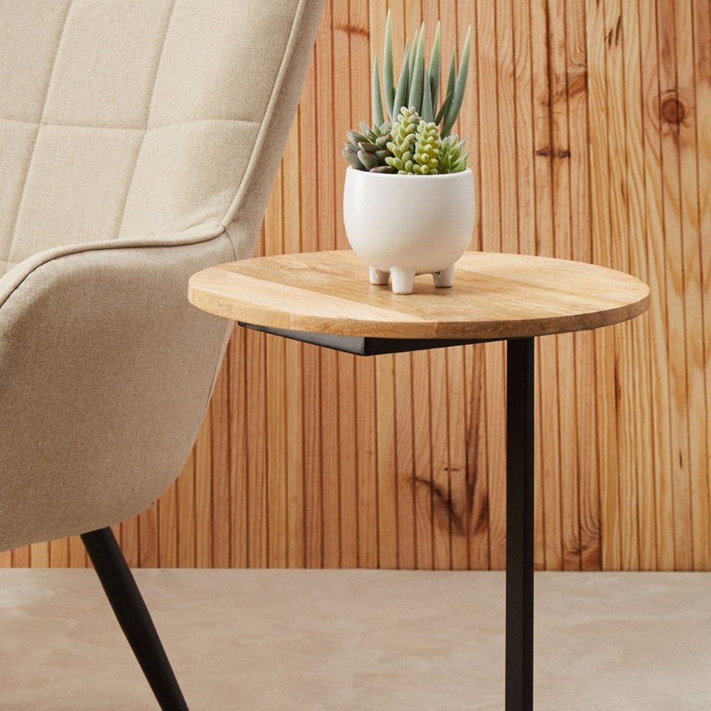 This side table features an asymmetric metal frame in matte black powder coating forming a C-shaped design. The light and airy frame creates a minimalistic style and supports a round wooden top in natural variation and rustic charm.