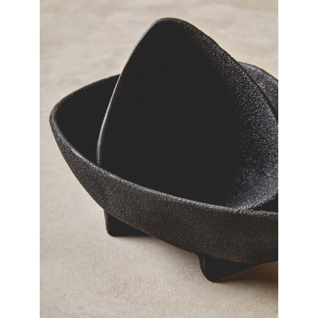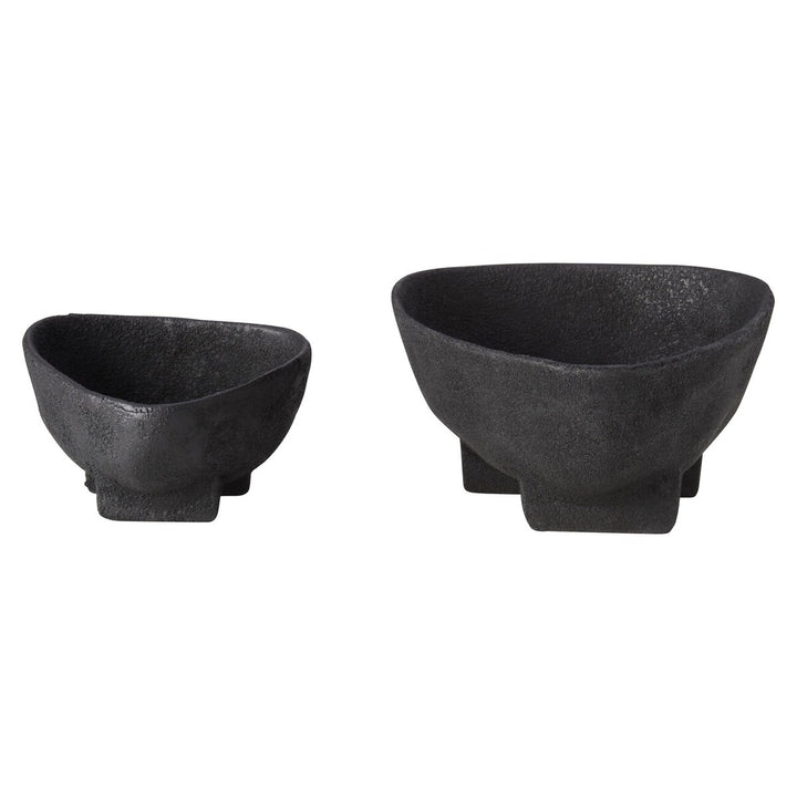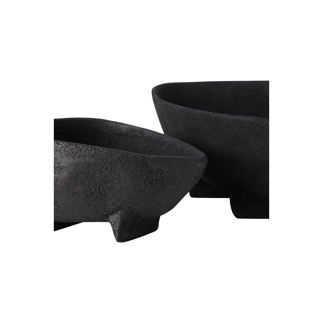 This set of two textured black aluminium bowls create a dynamic visual appeal with artfully curated sides. Each bowl is perched on a footed base, enhancing its aesthetic while ensuring stability and grace.