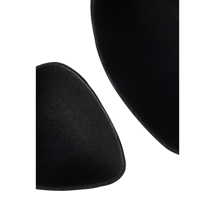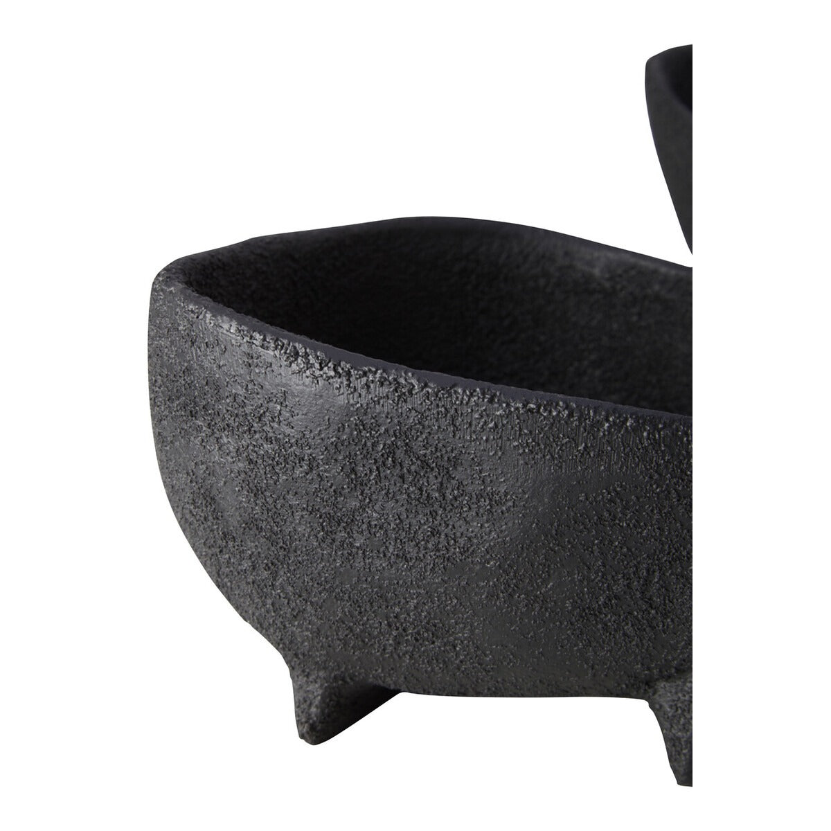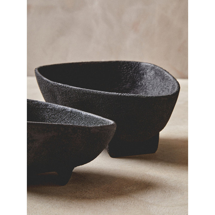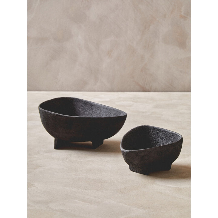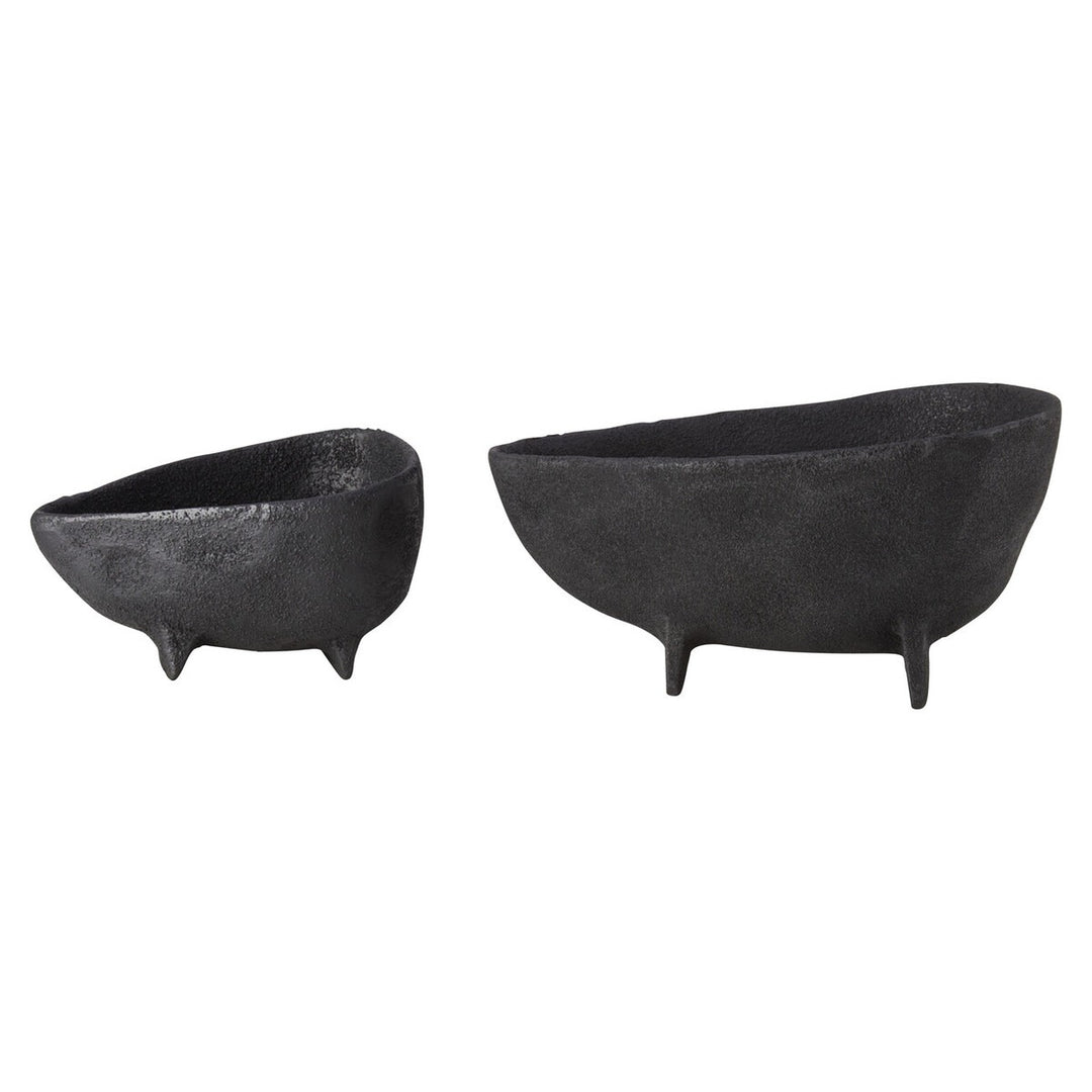 This set of two textured black aluminium bowls create a dynamic visual appeal with artfully curated sides. Each bowl is perched on a footed base, enhancing its aesthetic while ensuring stability and grace.
