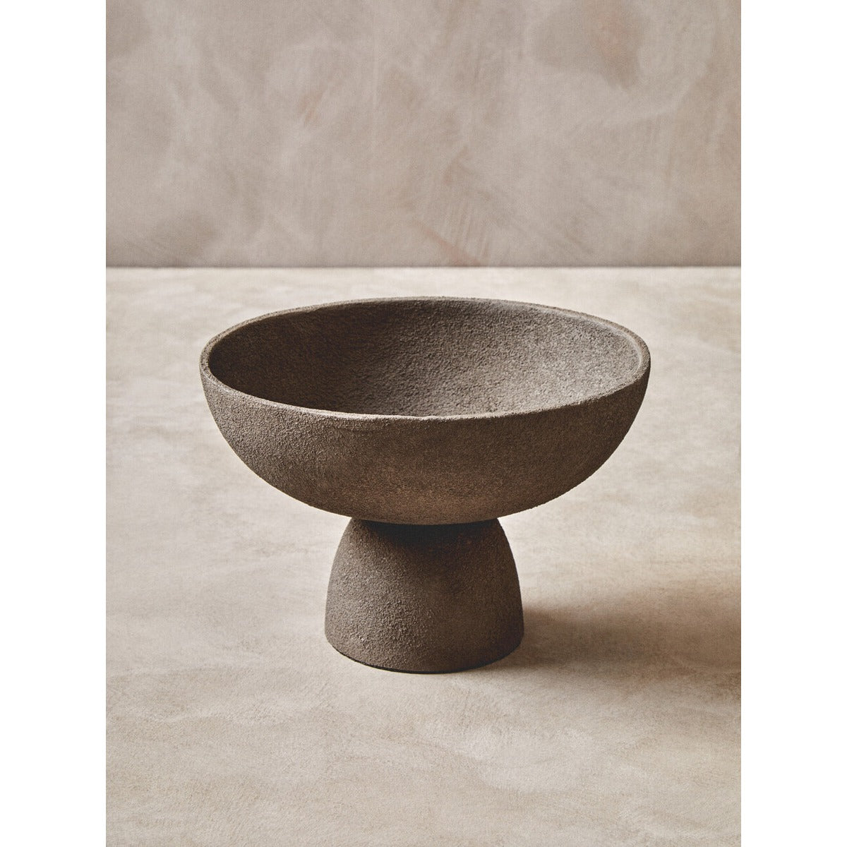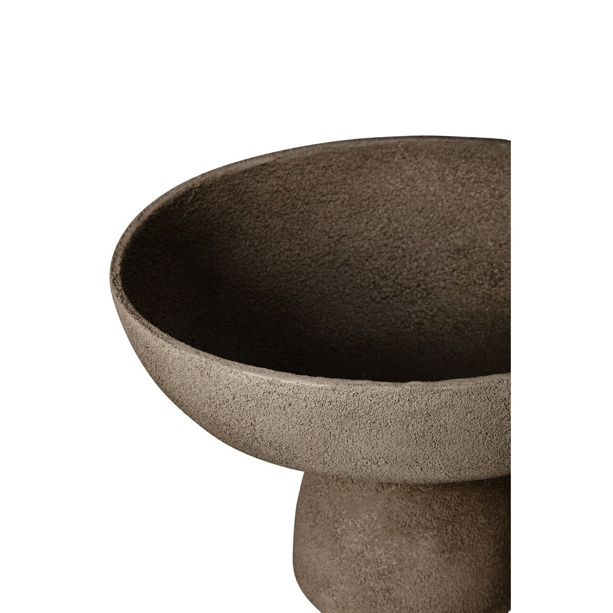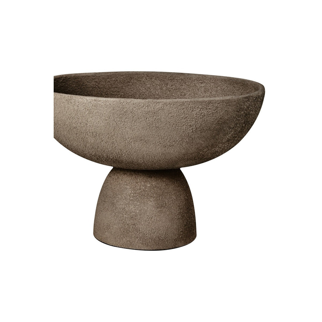 This small aluminum bowl has a sleek textured grey finish that effortlessly complements any decor. The bowl's pedestal base contributes to the aesthetic appeal and adds stability.