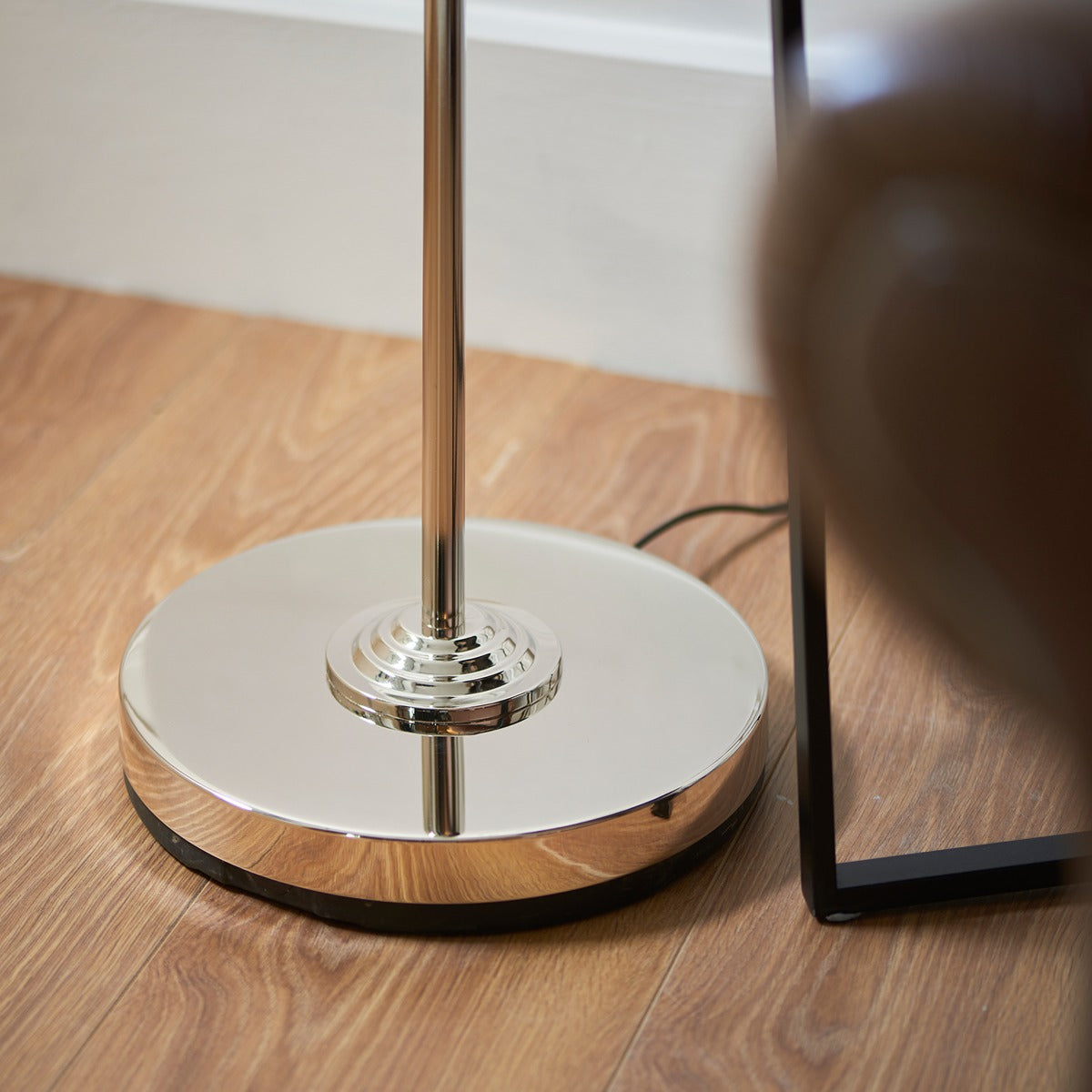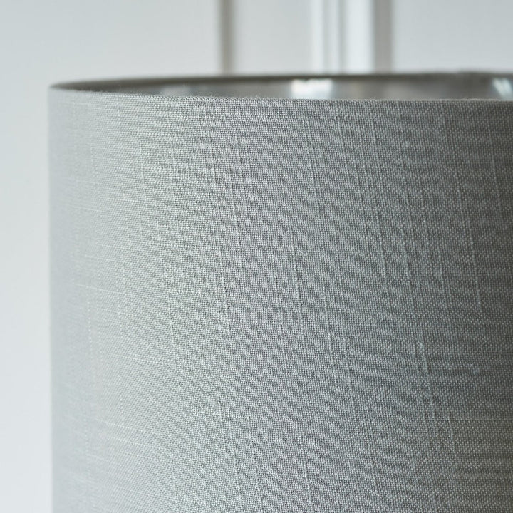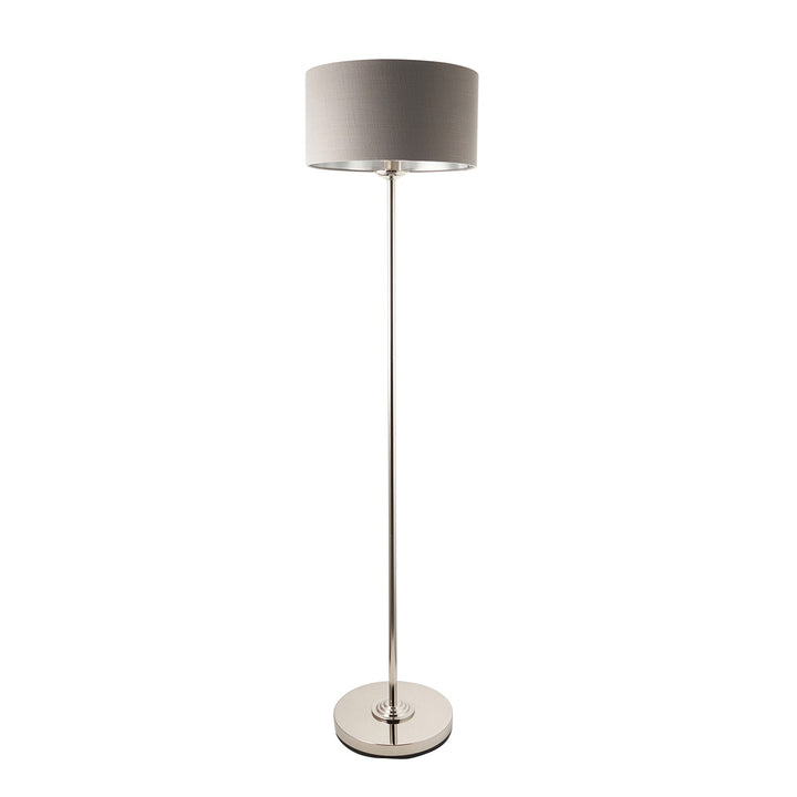 This floor lamp is a sophisticated mix of charcoal linen fabric with a reflective metallic inner and bright nickel metalwork. This statement floor lamp is the perfect timeless addition to modern and classic homes of today.