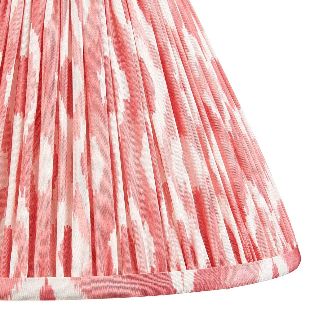 30cm tapered shade with white gimbal. Unique Ikat pattern design in coral pink with taped edge detailing and plain inner lining. Perfect when paired with one of our beautifully decorative table lights or floor lamps.