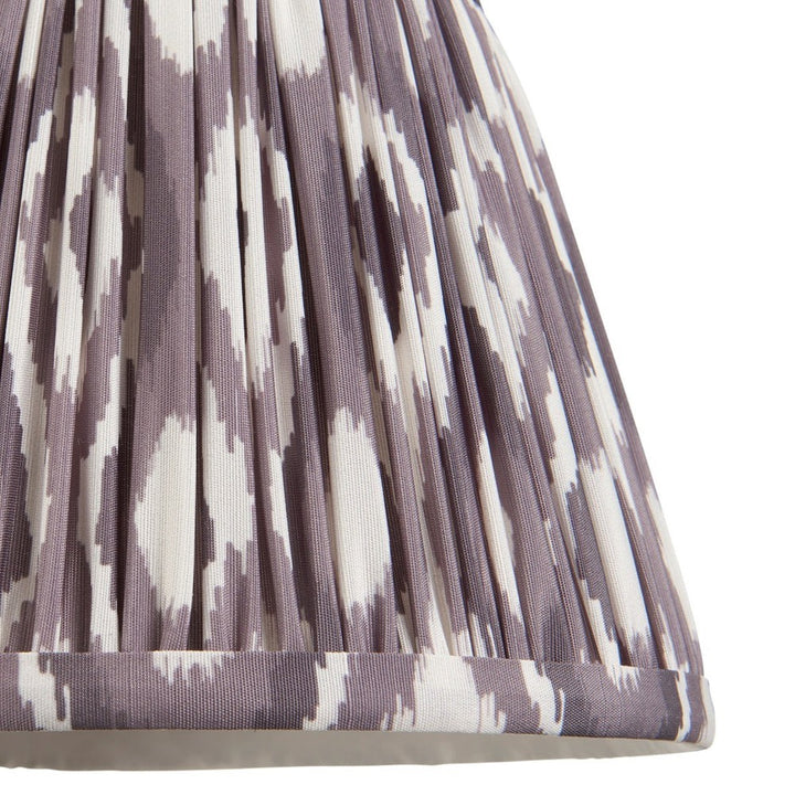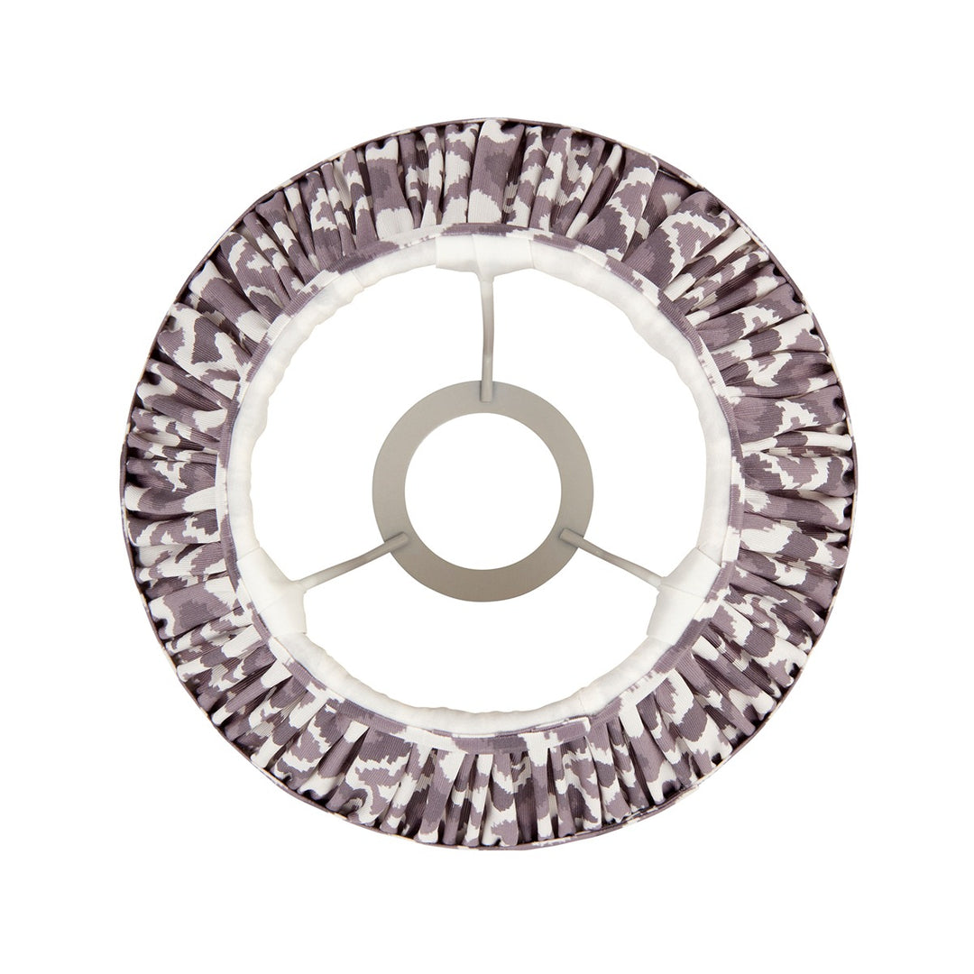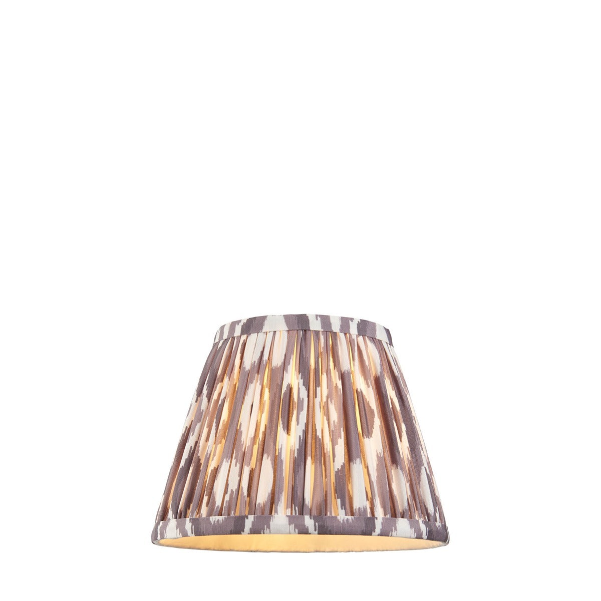 20cm tapered shade with white gimbal. Unique Ikat pattern design in pearl grey with taped edge detailing and plain inner lining. Perfect when paired with one of our beautifully decorative table lights, wall lights or chandeliers.
