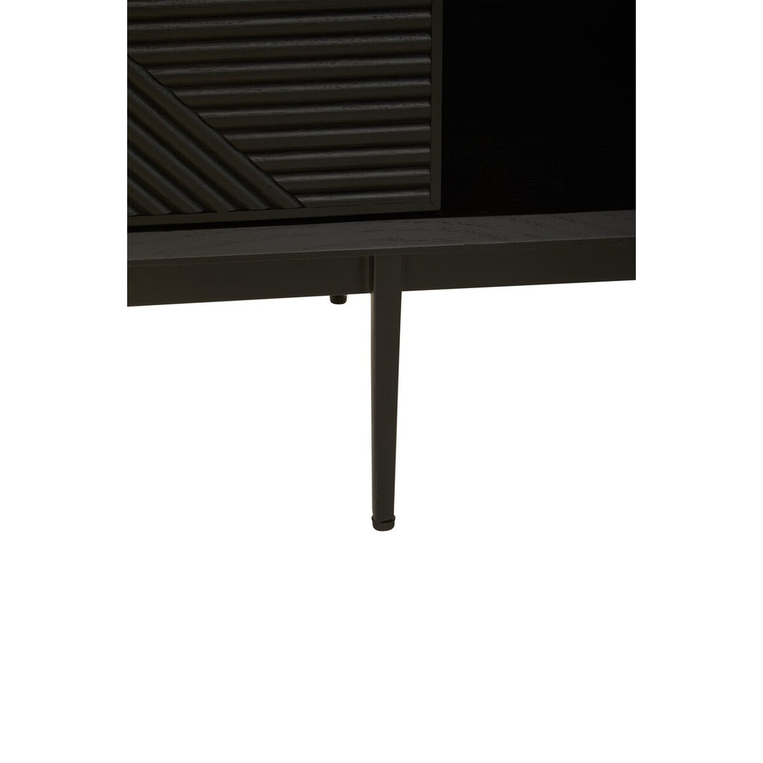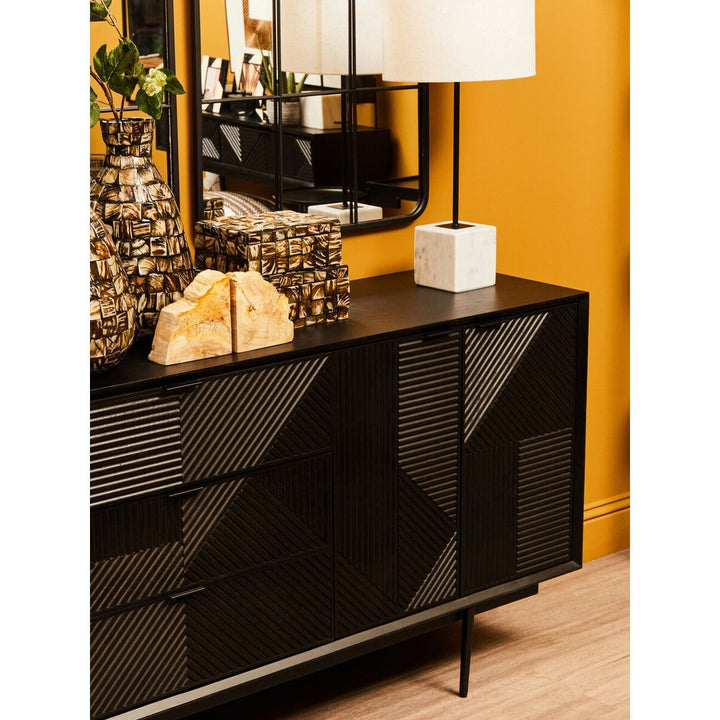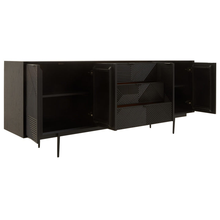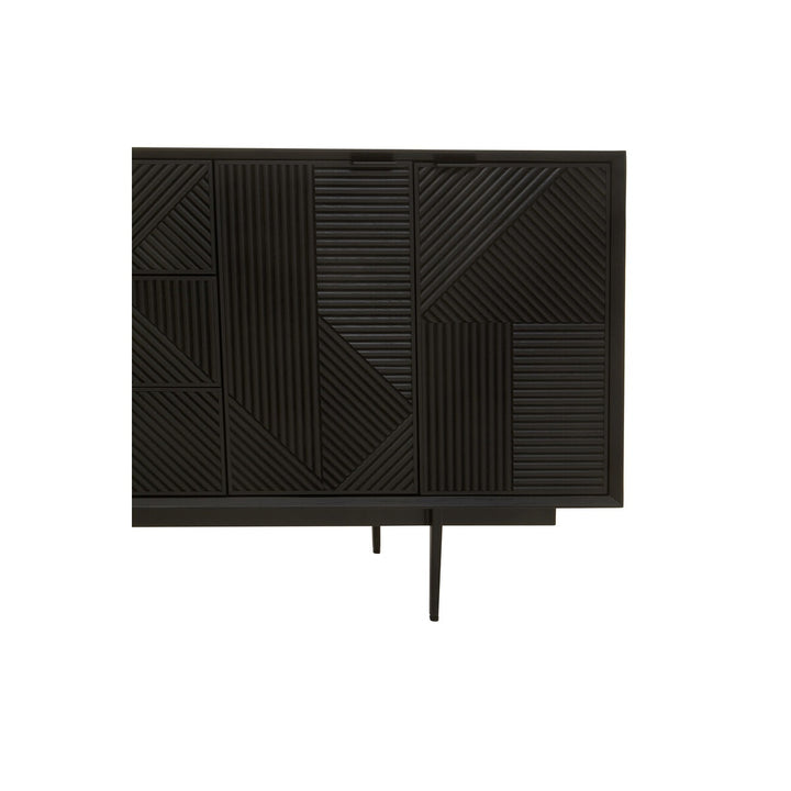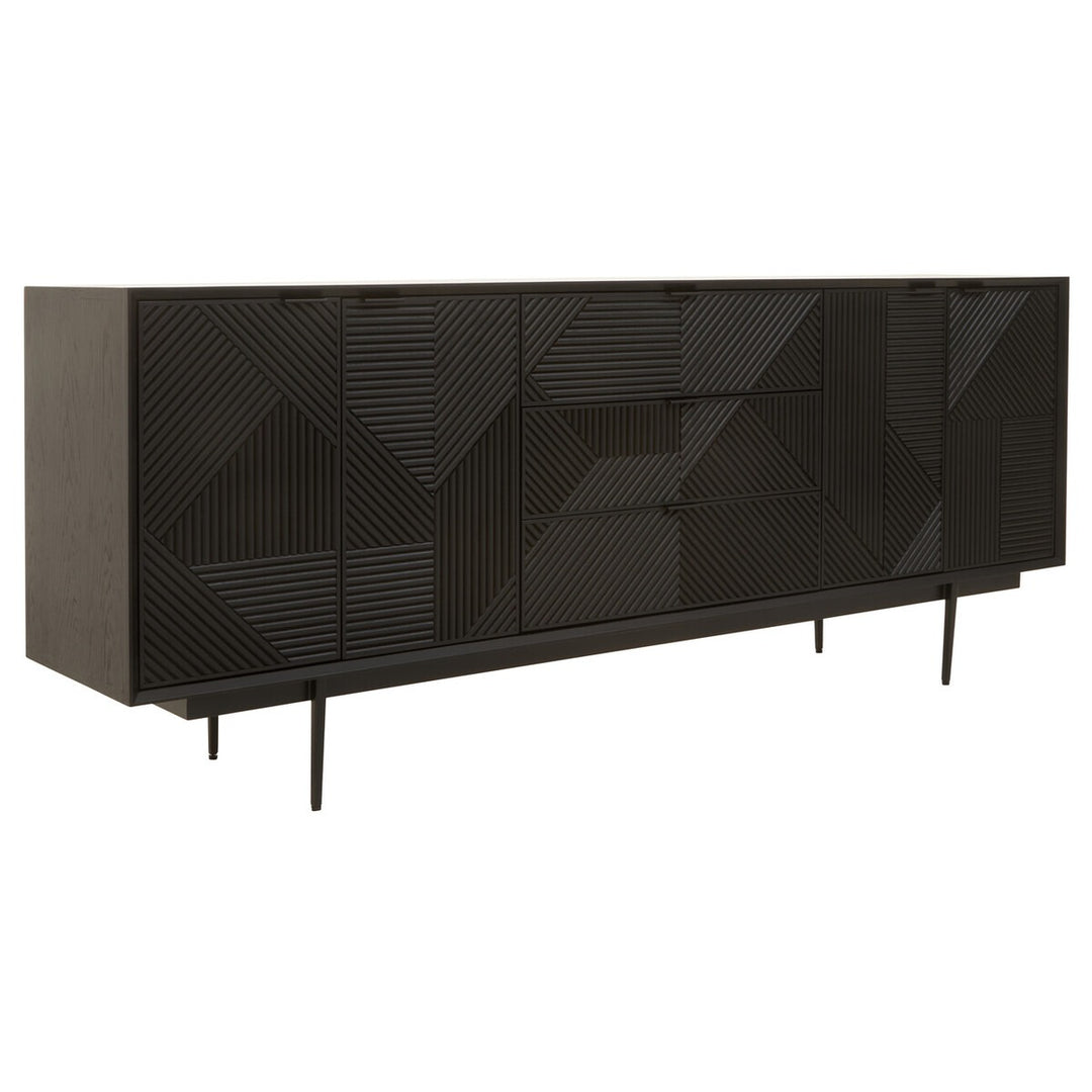 The Jakara sideboard has a carved effect black wood that features an abstract pattern. This side board has black finish metal legs contributing to its rustic design.