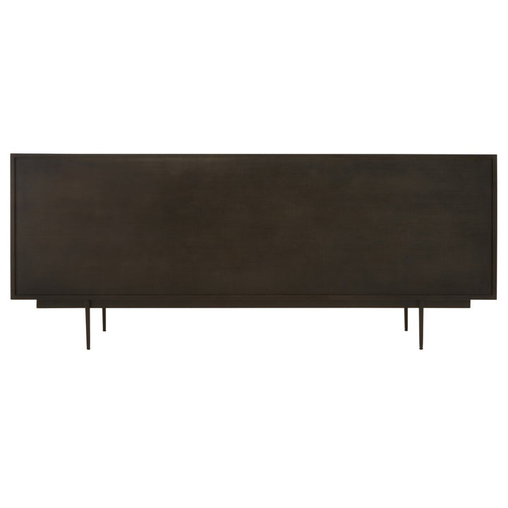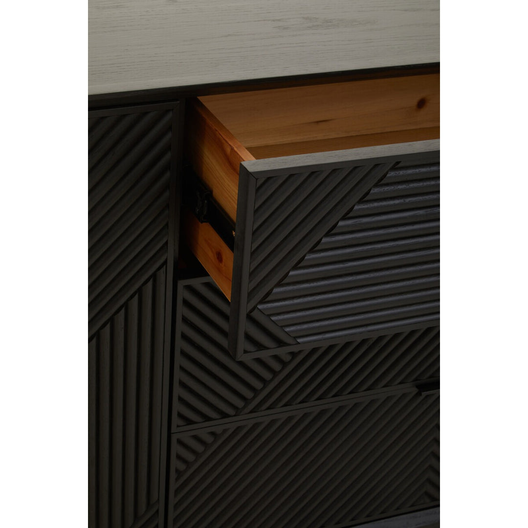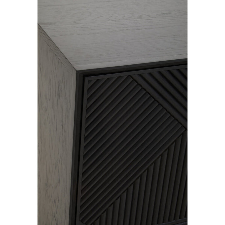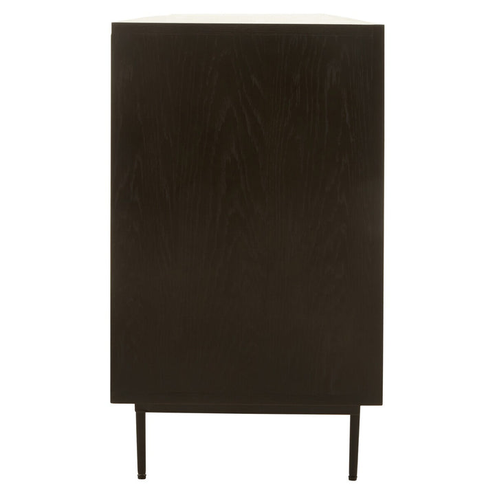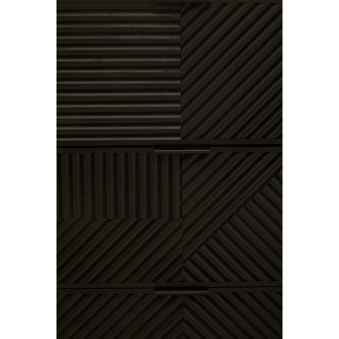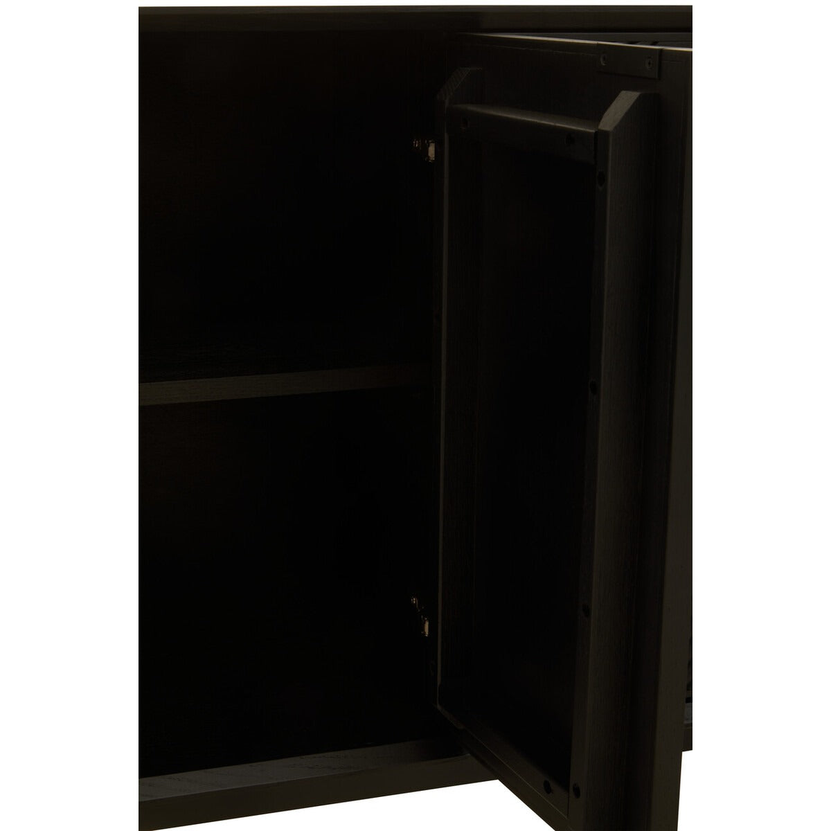 The Jakara sideboard has a carved effect black wood that features an abstract pattern. This side board has black finish metal legs contributing to its rustic design.