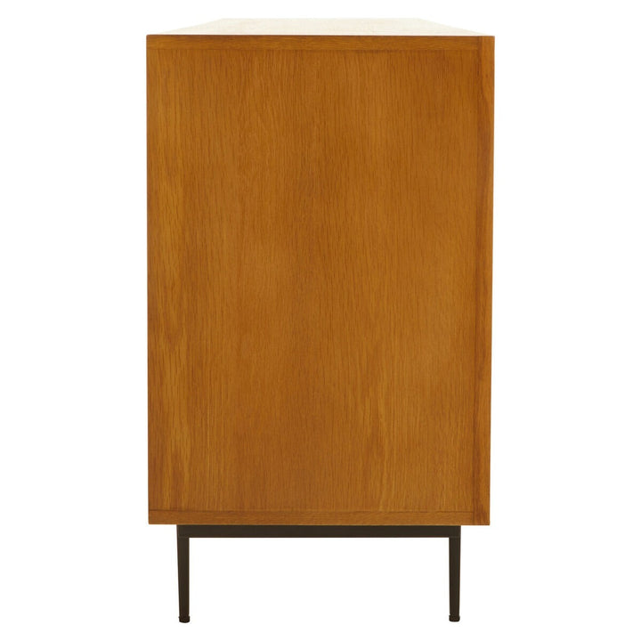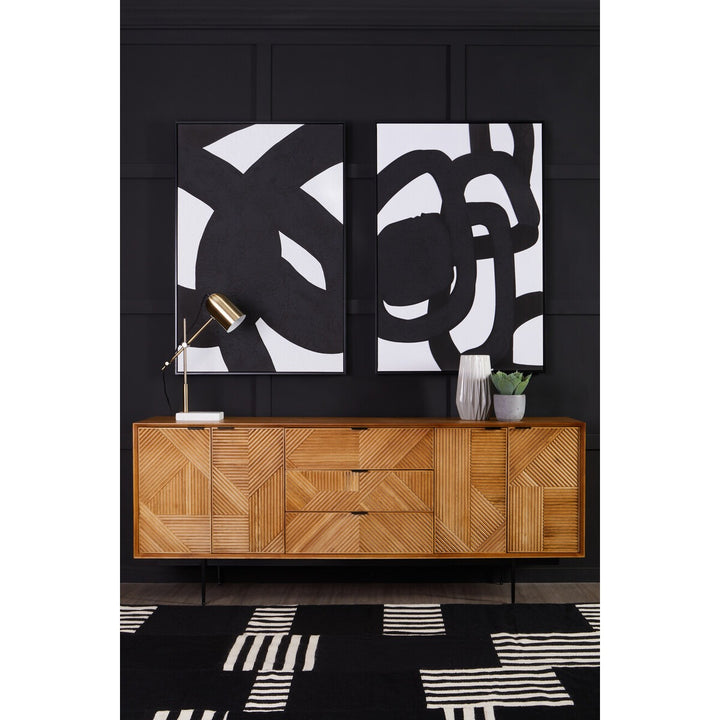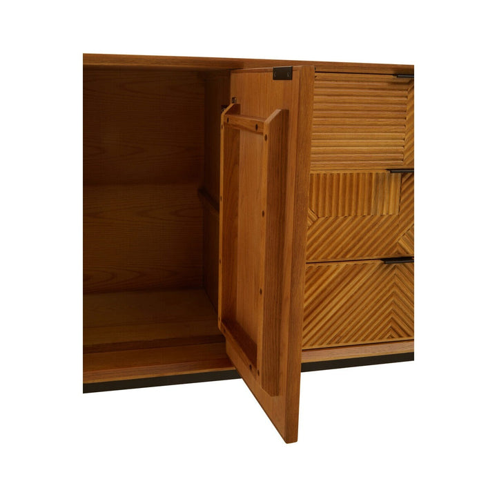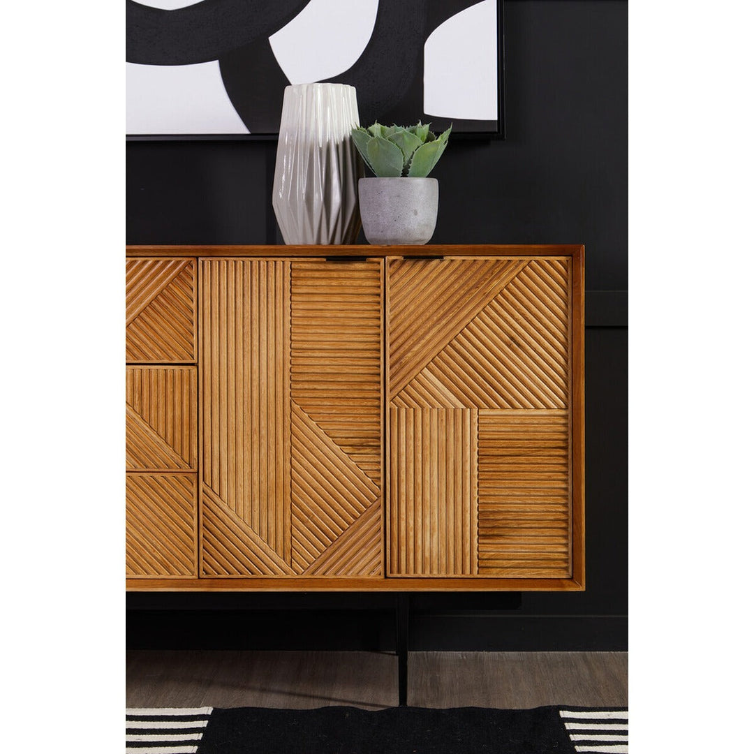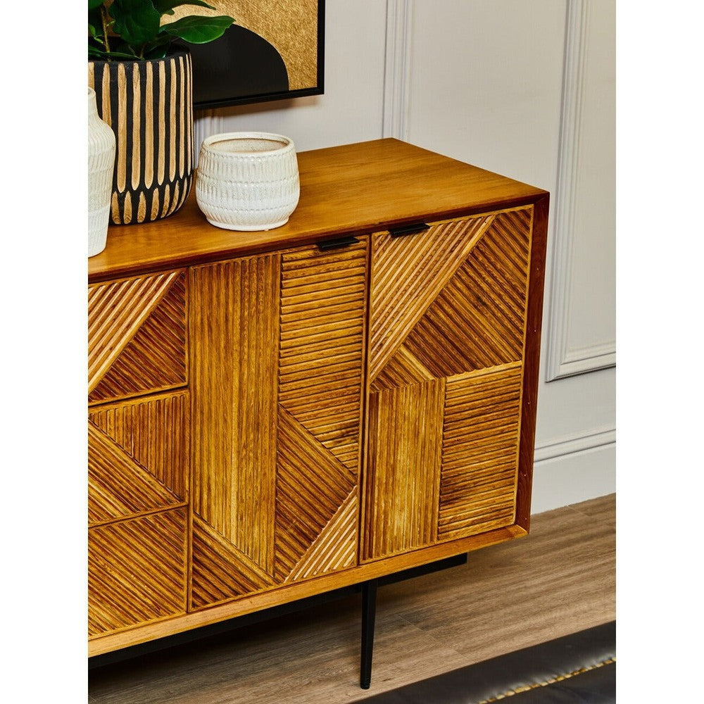 The Jakara sideboard has a carved effect wood that features an abstract pattern. This side board has black finish metal legs contributing to its rustic design.