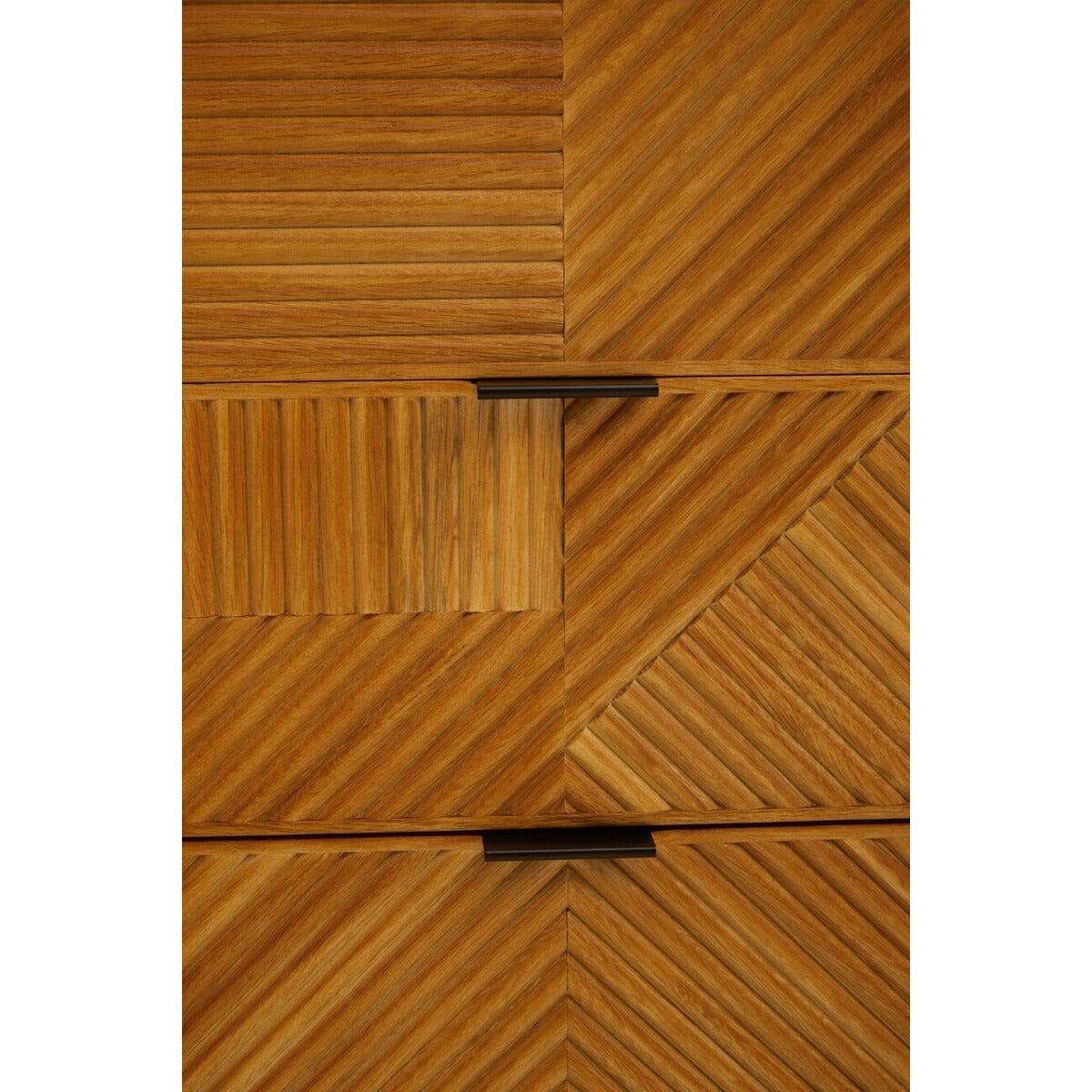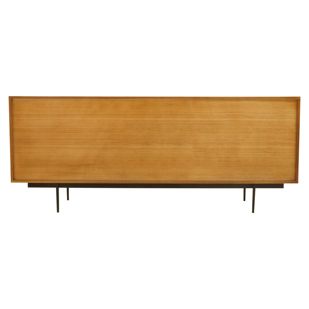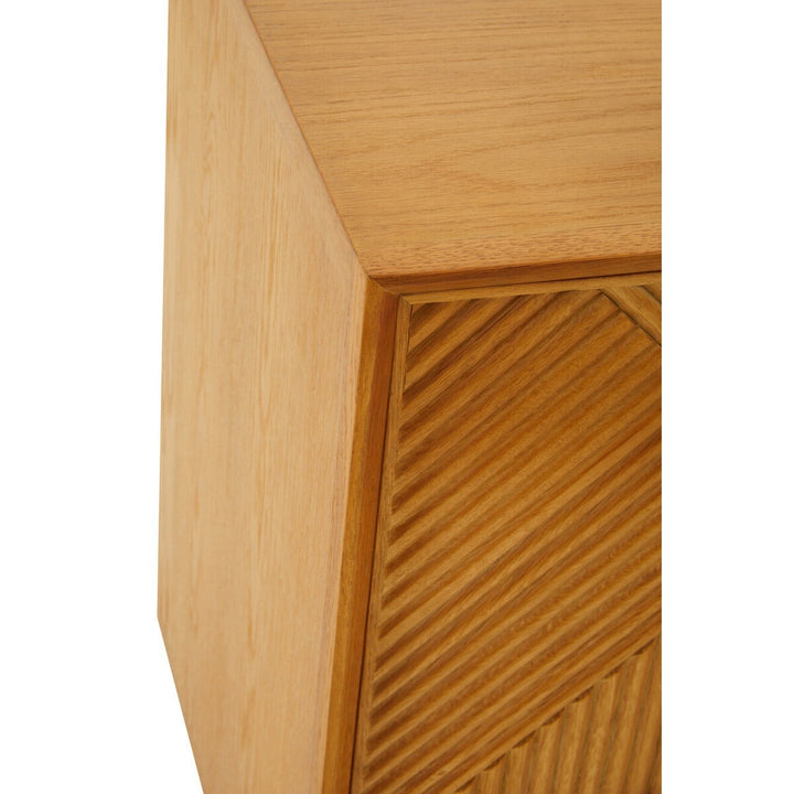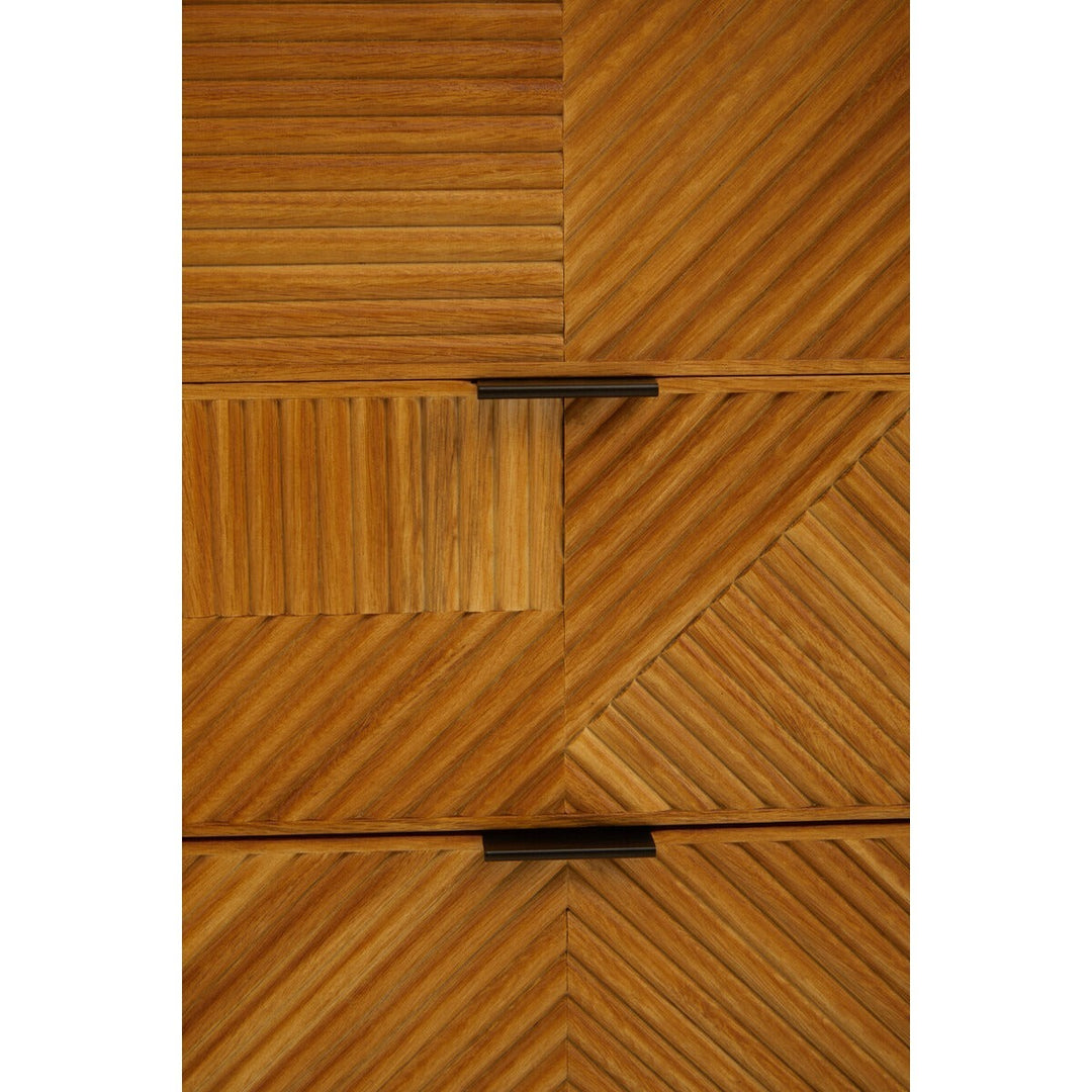 The Jakara sideboard has a carved effect wood that features an abstract pattern. This side board has black finish metal legs contributing to its rustic design.