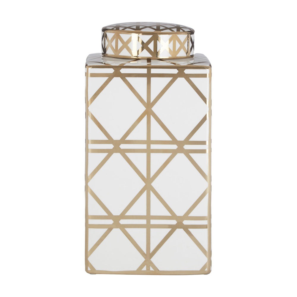 The curved, white façade of the jar is decorated beautifully with golden geometric patterns to create a highly contemporary look that evokes a glamourous feeling whilst embracing the opulence of the art deco style.