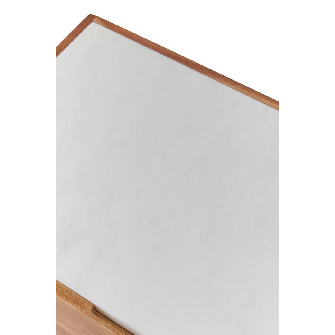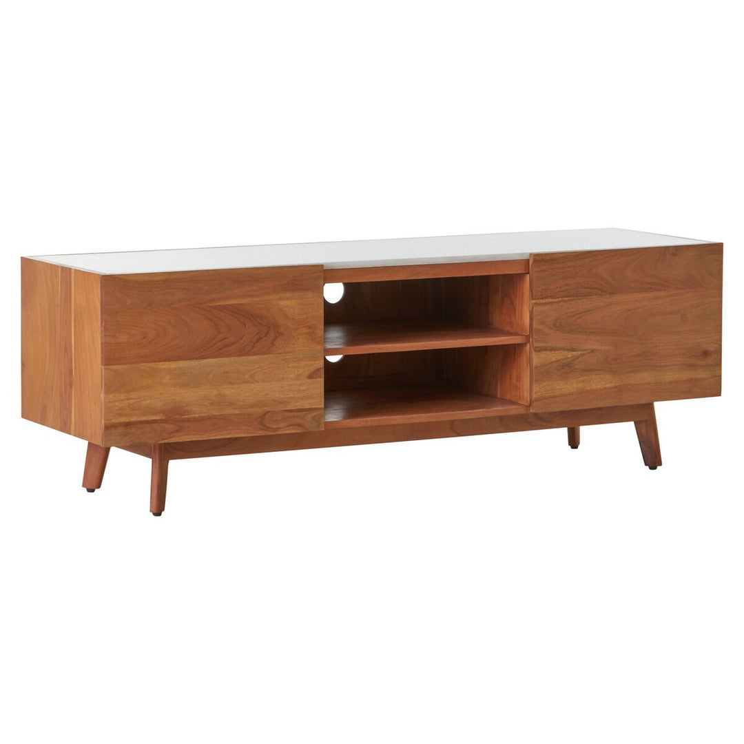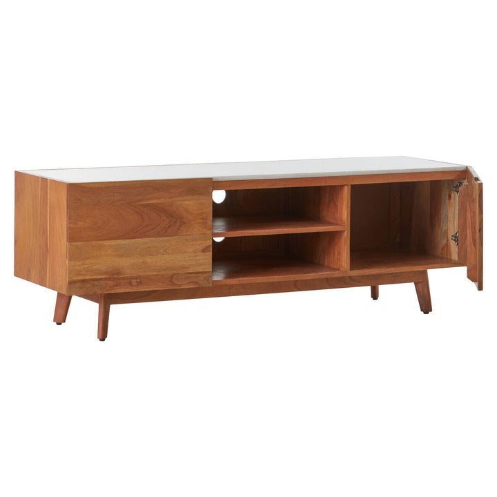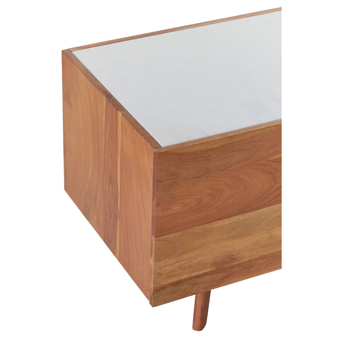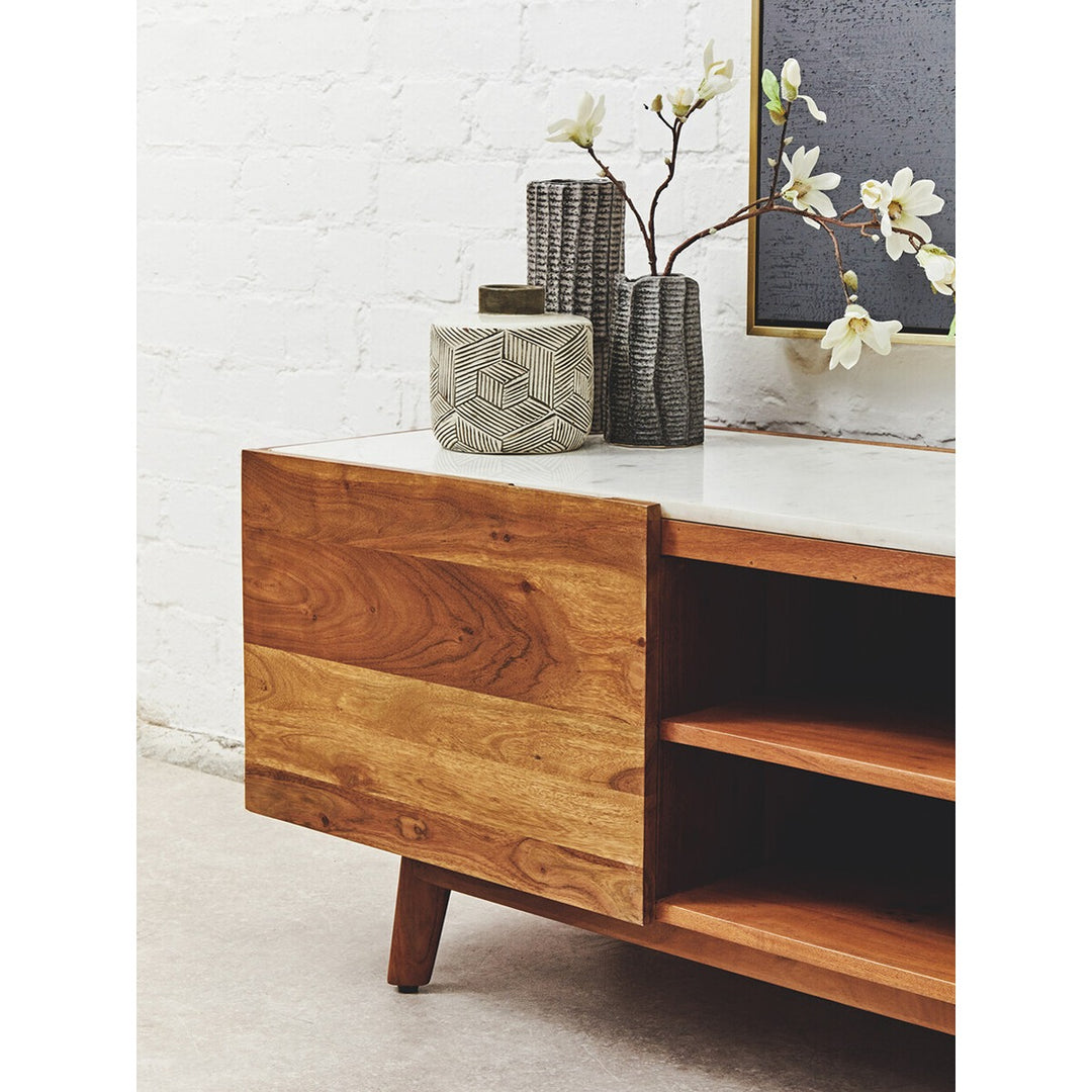 The Myan two door media unit, topped with elegant white marble, seamlessly blends contemporary design with functionality. Perfect for storing remotes, magazines, and more, its legs and base are crafted from sustainable acacia wood.