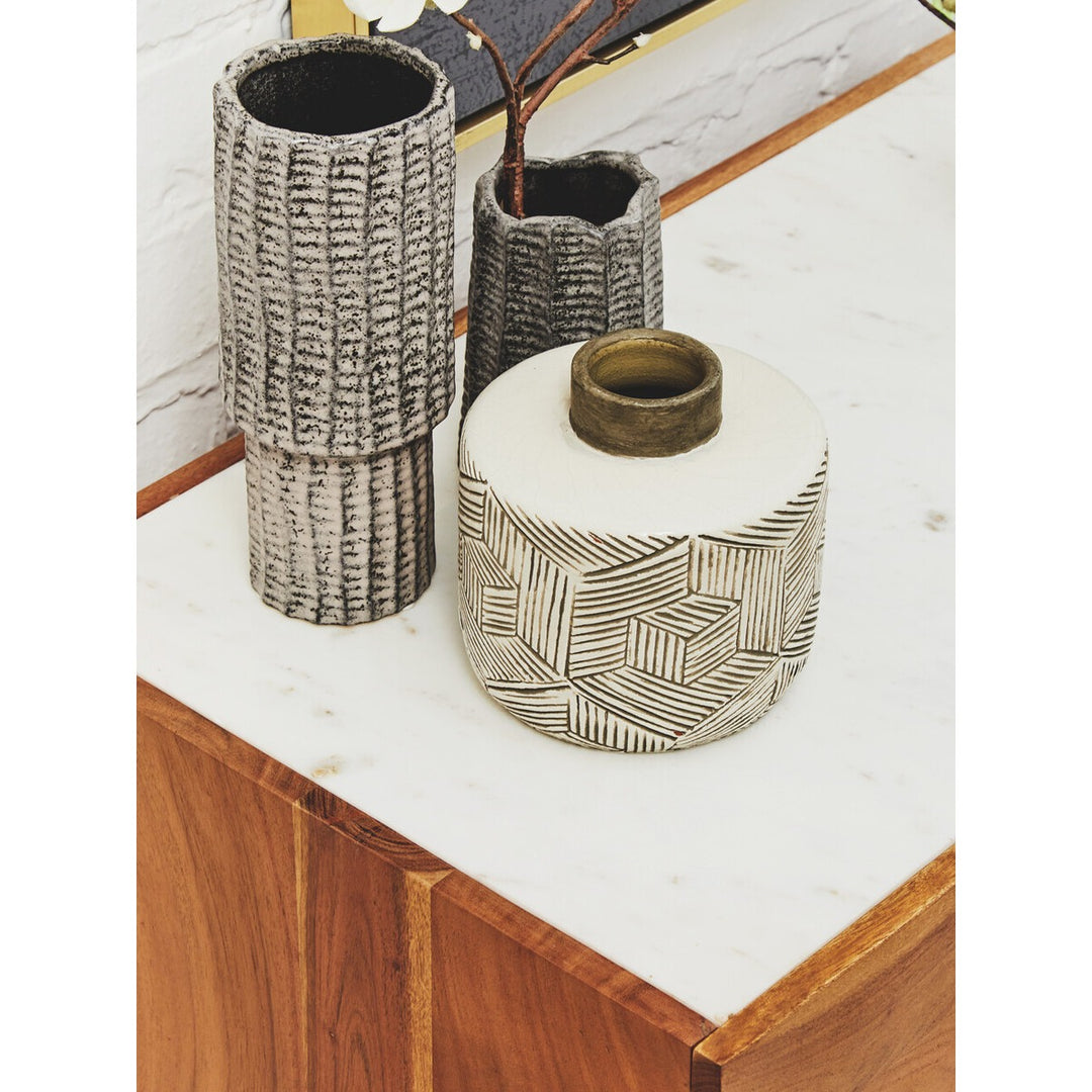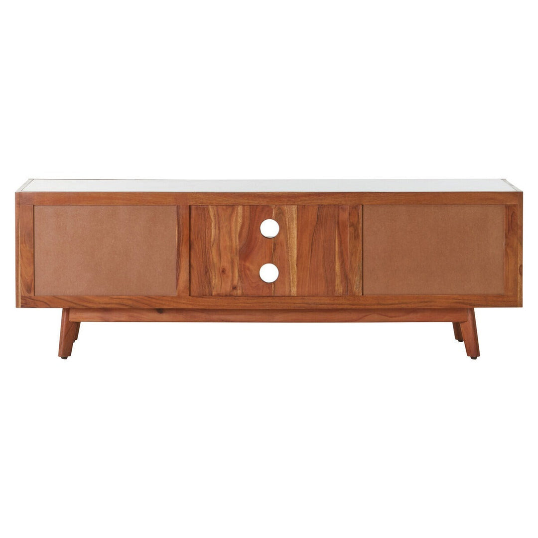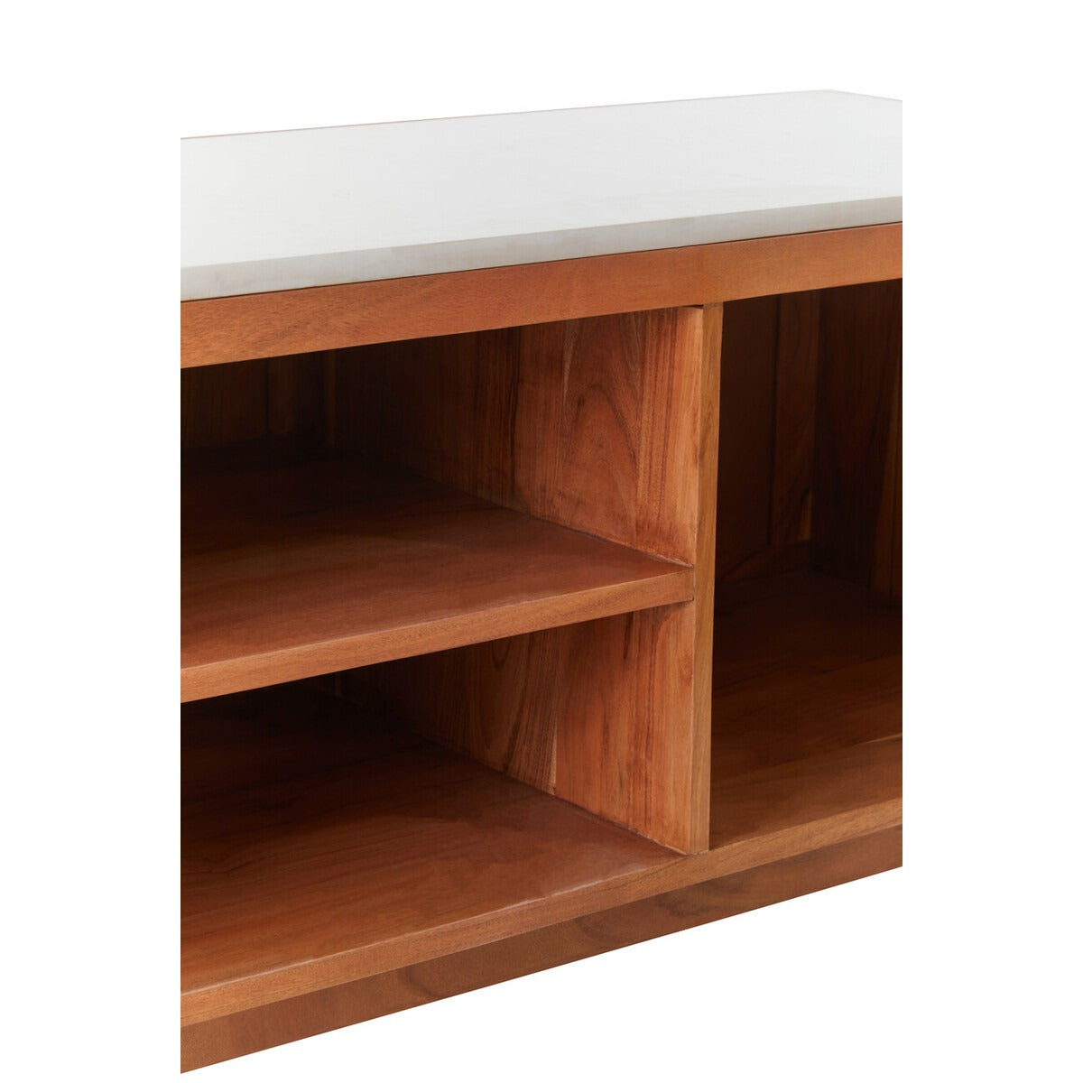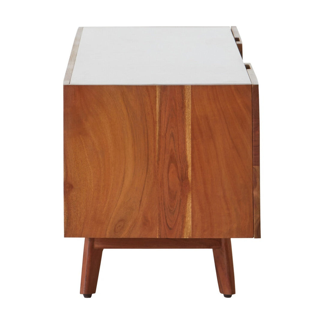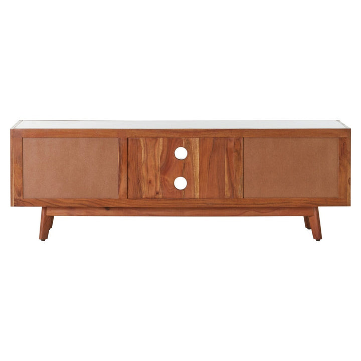 The Myan two door media unit, topped with elegant white marble, seamlessly blends contemporary design with functionality. Perfect for storing remotes, magazines, and more, its legs and base are crafted from sustainable acacia wood.