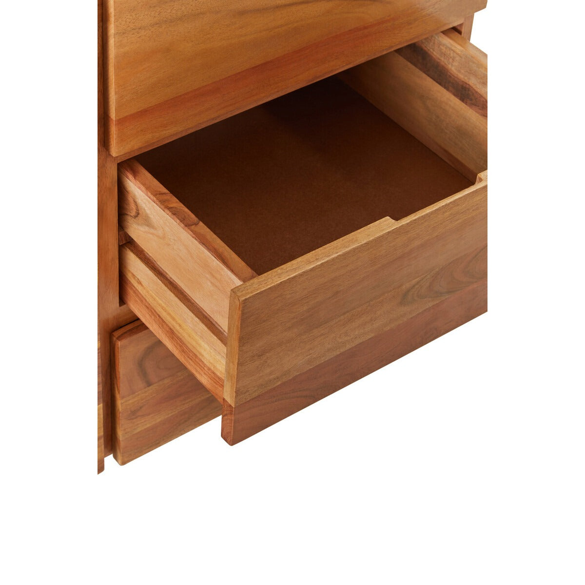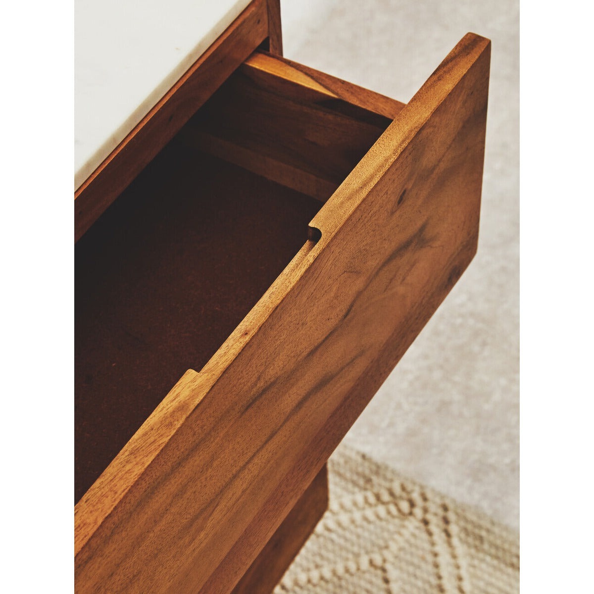 The Myan three drawer sideboard combines contemporary design with ample storage and a luxurious white marble top. Crafted from sustainable and durable acacia wood, its legs and base ensure longevity and style.