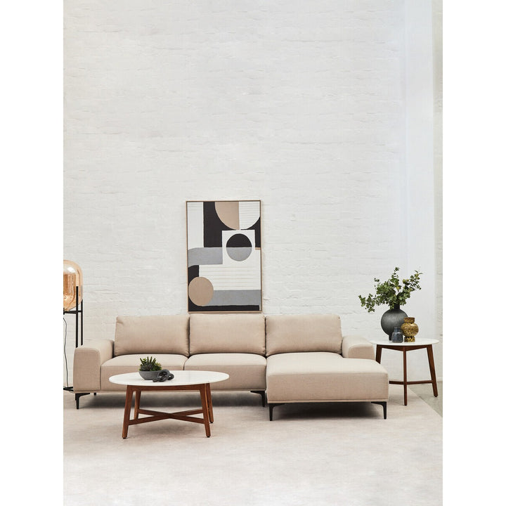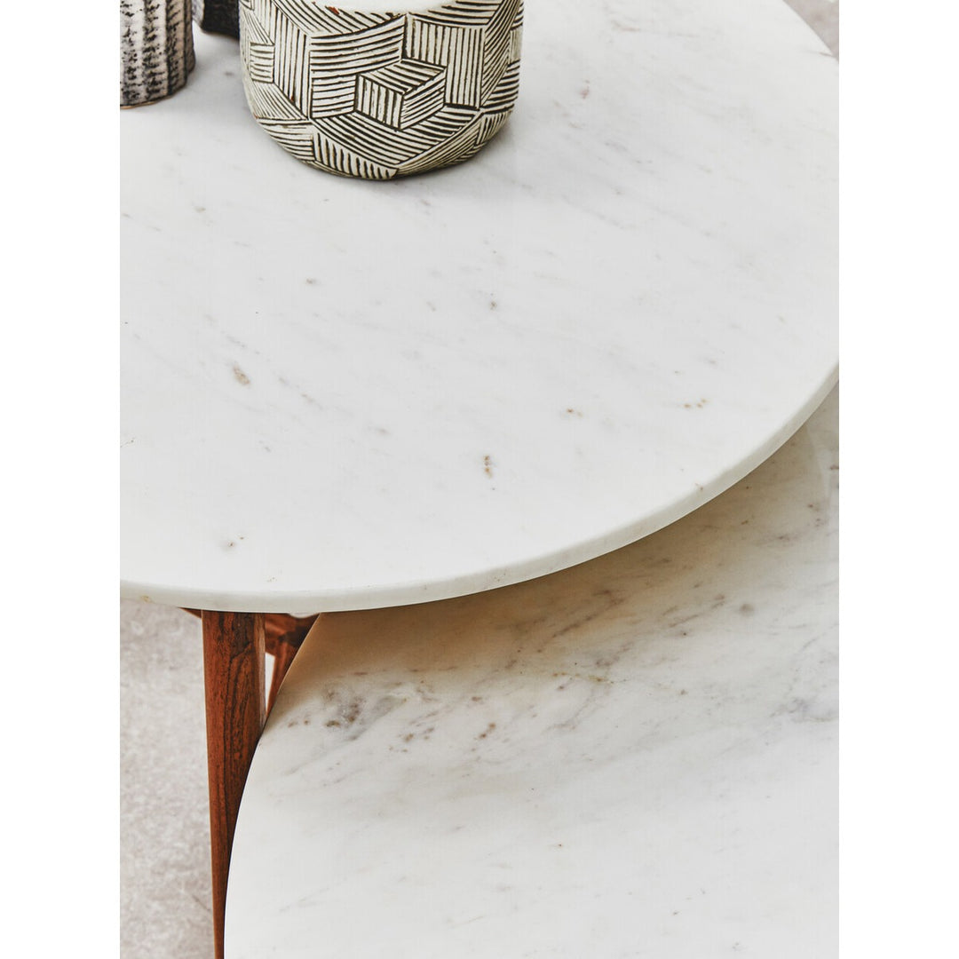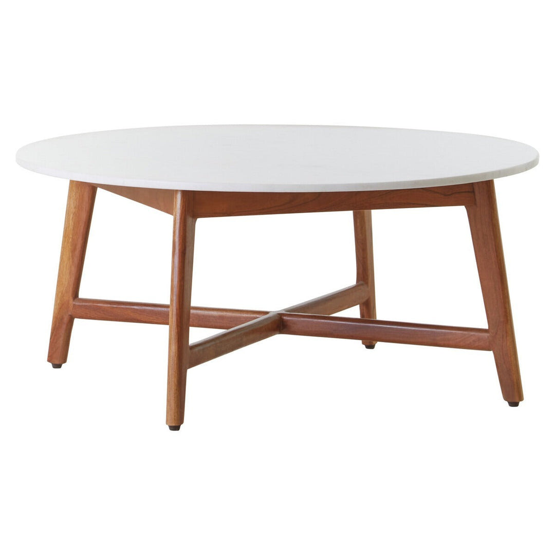 Elevate modern interior with the Myan round coffee table. Featuring a sleek white marble top and sustainably sourced acacia wood legs, this durable piece effortlessly combines style and sustainability.