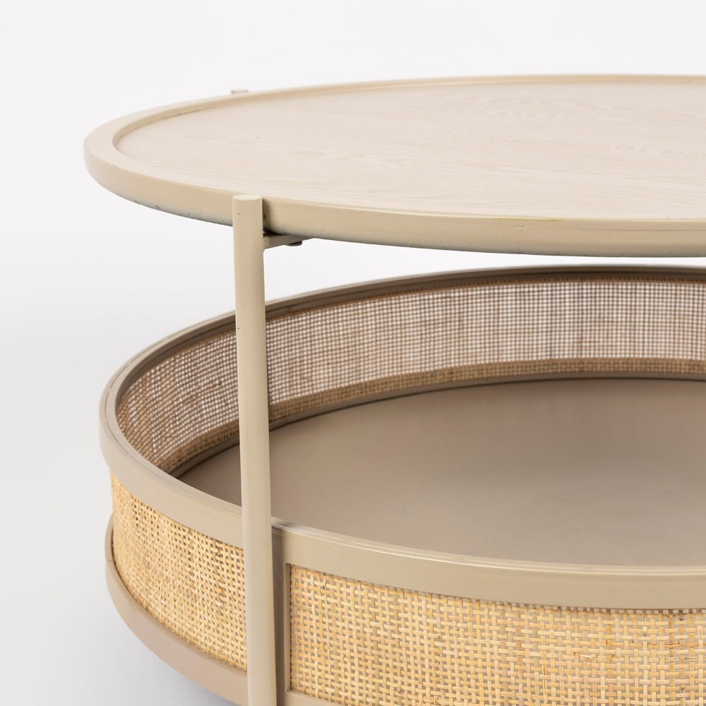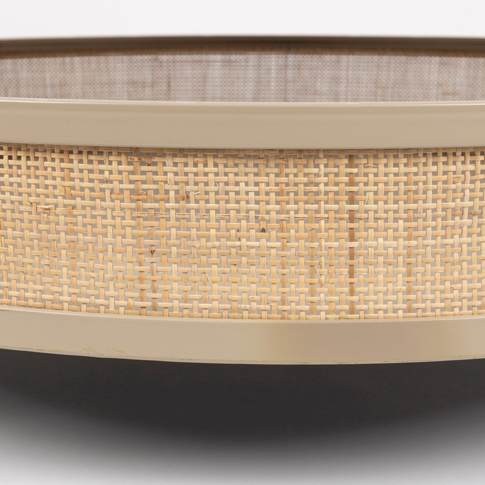 Materials: MDF tabletop with rattan sides. Powder coated iron legs.