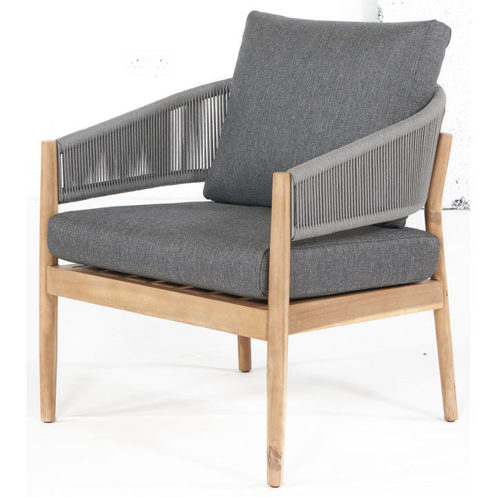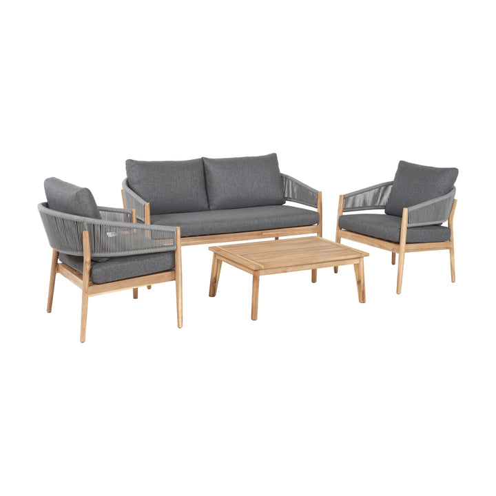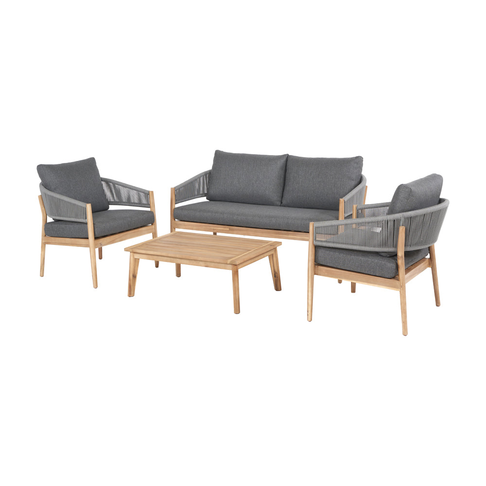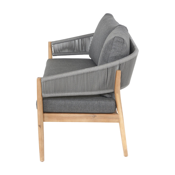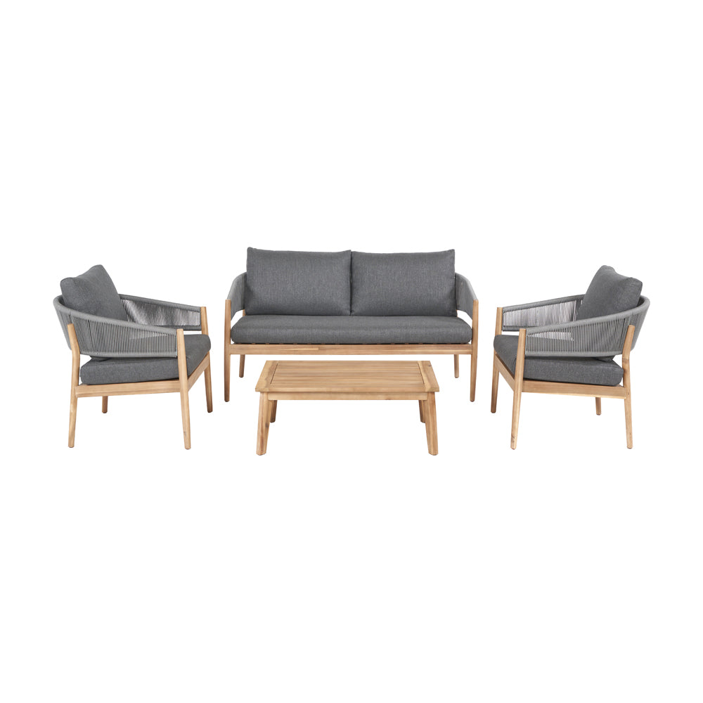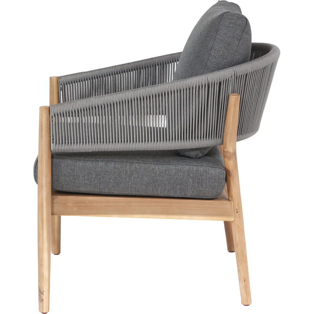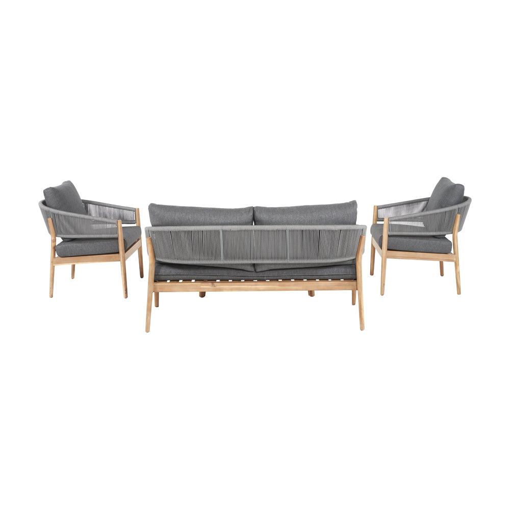 Transform your outdoor area into a modern and on-trend space with Olivia"s Outdoor Dala Lounge Set Grey. Crafted with sophistication, this set features the Denver Lounge Set, consisting of a 2-seater sofa and 2 armchairs. The contemporary twisted poly rope mixed with a gorgeous acacia wood frame provides a striking contrast, adding a touch of luxury to your outdoor space. The twisted poly rope, strong and durable, offers a delicate and intricate look while maintaining a taught structure with no sagging, thanks to its weatherproof properties. The acacia wood frame ensures high-quality robustness and sustainability, making it an excellent choice for outdoor furniture. Each comfortable cushion with stylish grey polyester cover is season-proof and fire-retardant, ensuring the highest quality and durability. Experience outdoor lounging in style with the Denver Lounge Set, perfect for relaxation and entertaining in your garden or patio.