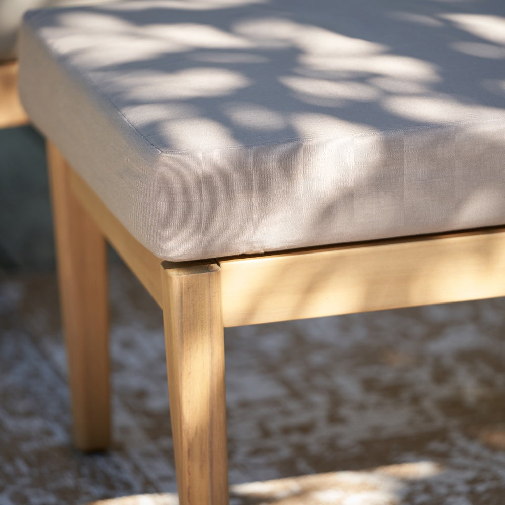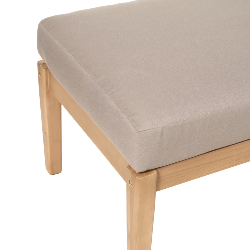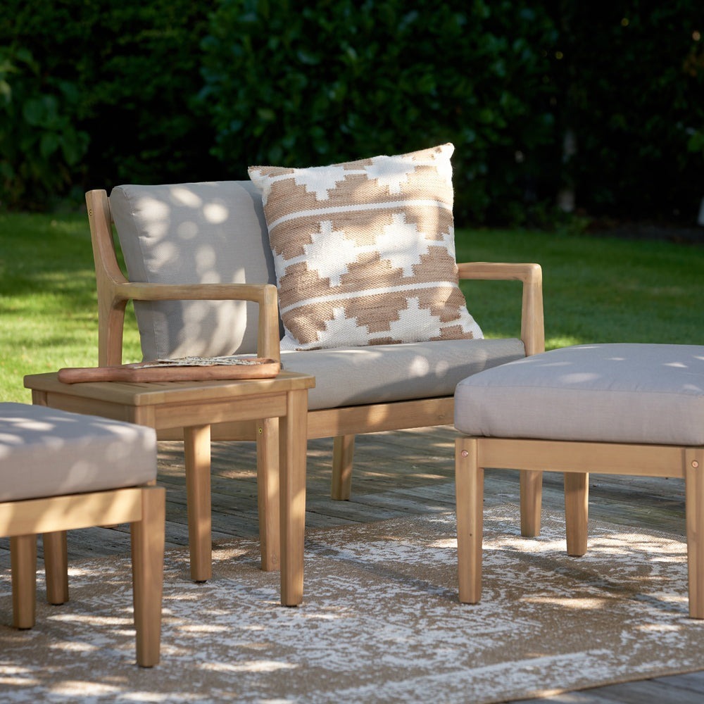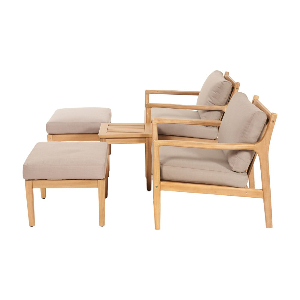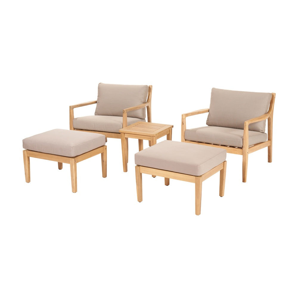 Enhance your outdoor lounging space with Olivia"s Outdoor Mauritius Light Teak Finish 5 Piece Hocker Set. Handcrafted in Vietnam, this set offers a sleek design that will give your garden a contemporary update. Featuring a Light Teak Effect Acacia Wood frame and Light Linen Effect Taupe cushions, this hocker set combines style with comfort effortlessly. The set includes 2 armchairs, 2 footstools, and a side table, providing versatility and functionality. The sleek and slimline acacia wood frame is environmentally friendly, quick-growing, and durable, ensuring long-lasting use. Each comfortable cushion is season-proof, guaranteeing the highest quality for your outdoor lounging enjoyment. Whether used as additional seating or for relaxation, the Malta Hocker Set adds sophistication and style to any outdoor space. Experience ultimate comfort and elegance with this contemporary outdoor furniture set, perfect for gatherings or quiet moments outdoors.