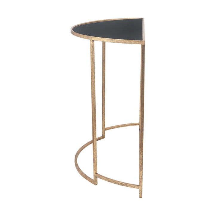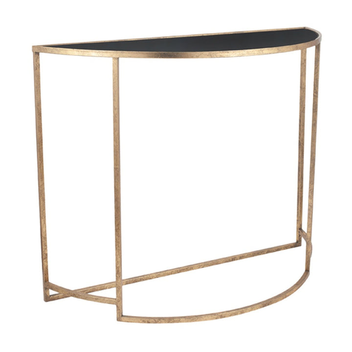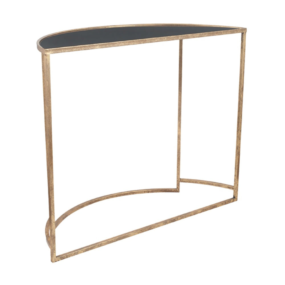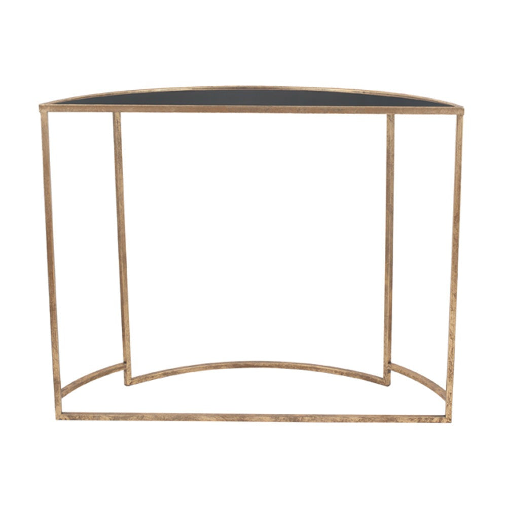 This striking half moon console table is finished in a beautiful black glass top with slim gold metal frame legs. This contemporary table offers style and functionality to give a modern aspect to your living space.