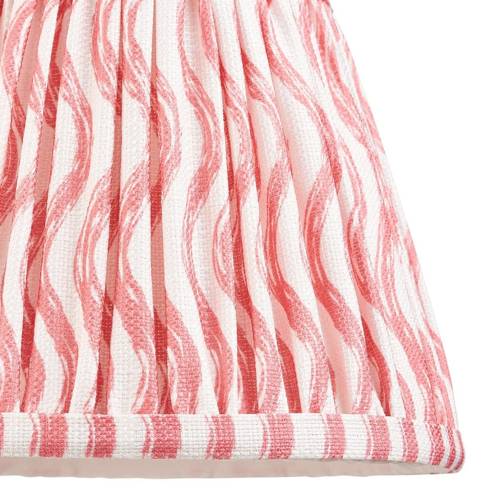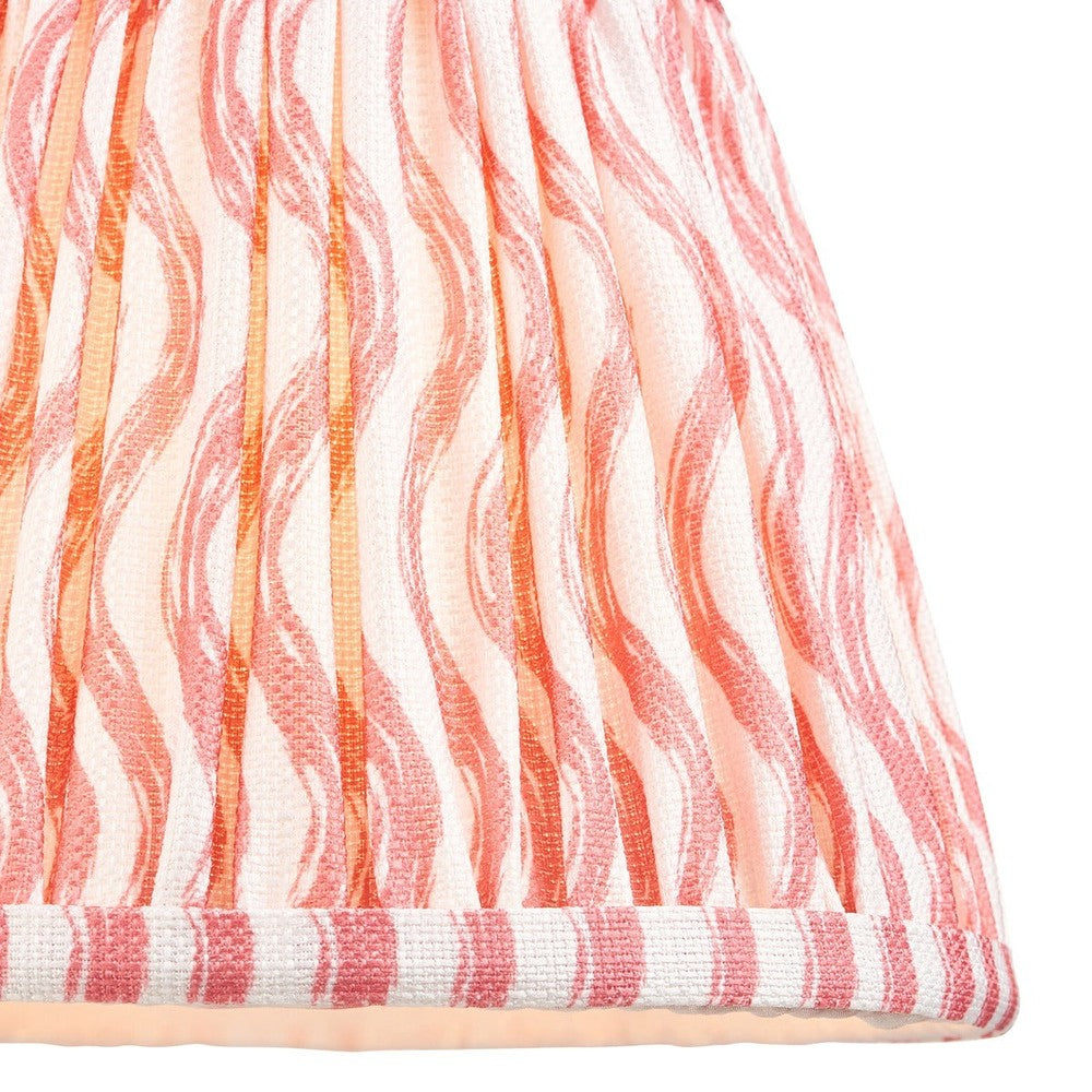 20cm tapered shade with white gimbal. Ripple pattern in coral pink colour with taped edge detailing and plain inner lining. Perfect when paired with one of our beautifully decorative table lights, wall lights or chandeliers.