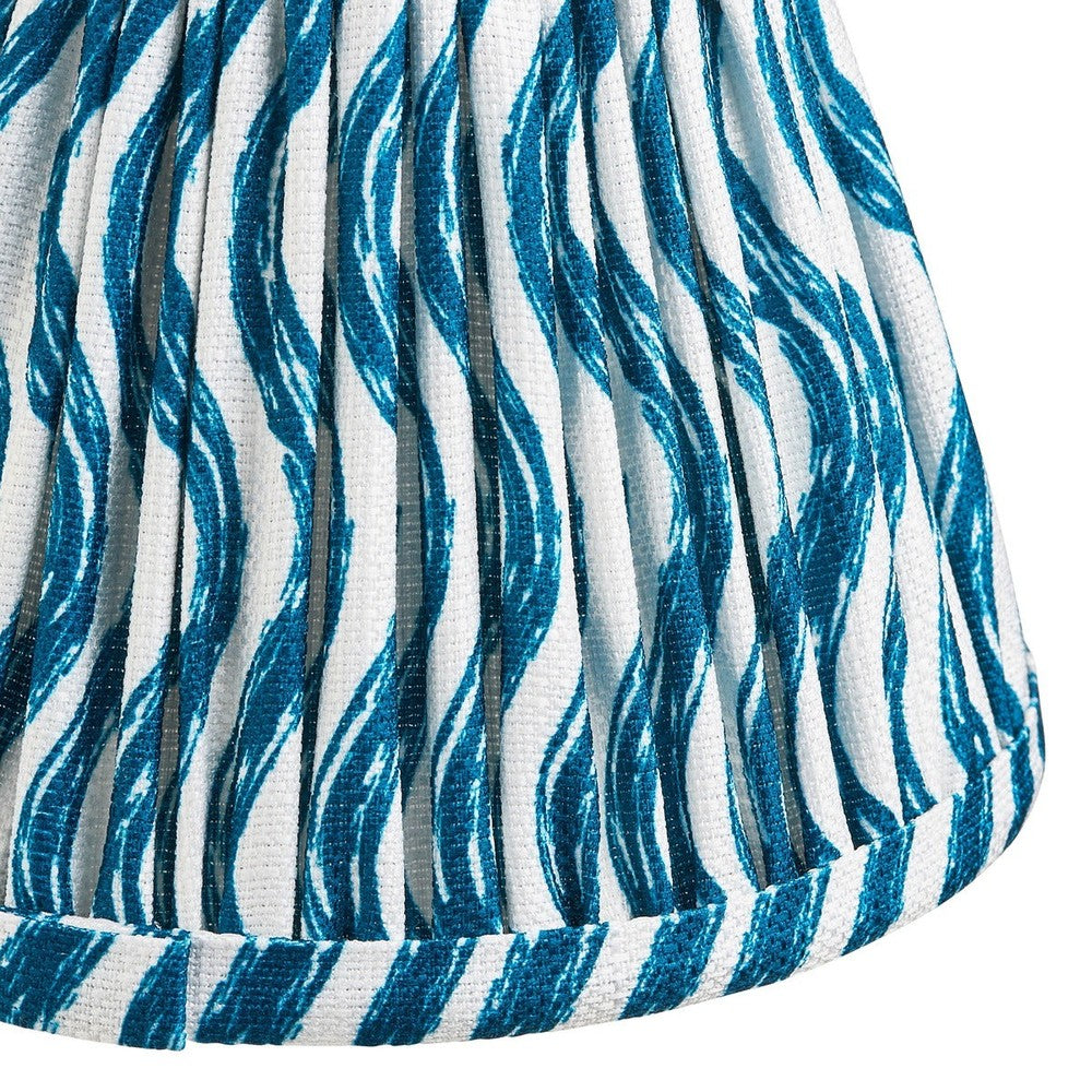 16cm tapered shade with clip gimbal to fit golf or candle. Ripple pattern in marlin blue colour with taped edge detailing and plain inner lining. Perfect when paired with one of our beautifully decorative table lights, wall lights or chandeliers.