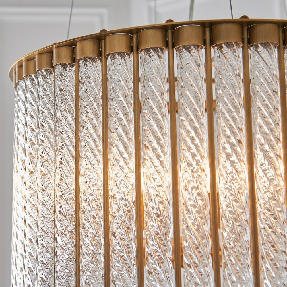 This stunning ceiling pendant consists of a six-armed chandelier enrobed by columns of delicately twisted clear glass. The matt gold finish provides a striking contrast to the clear glass, through which the light shimmers seductively.