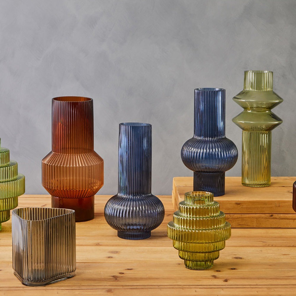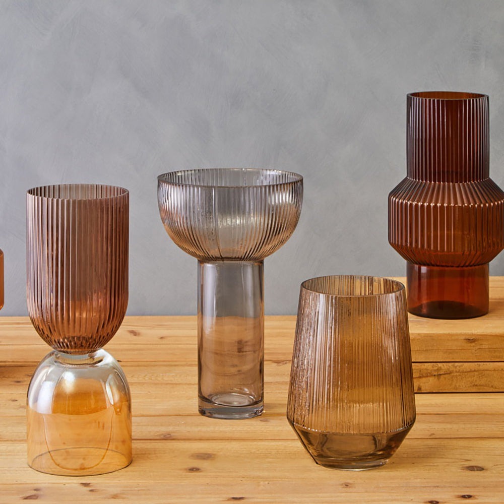 The Benky Vase in brown is part of Olivia's Soft Industrial Collection. This gorgeous decorative glass vase is a stunning addition to any home, and its detailed finish adds an air of sophistication.