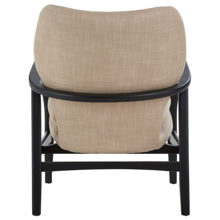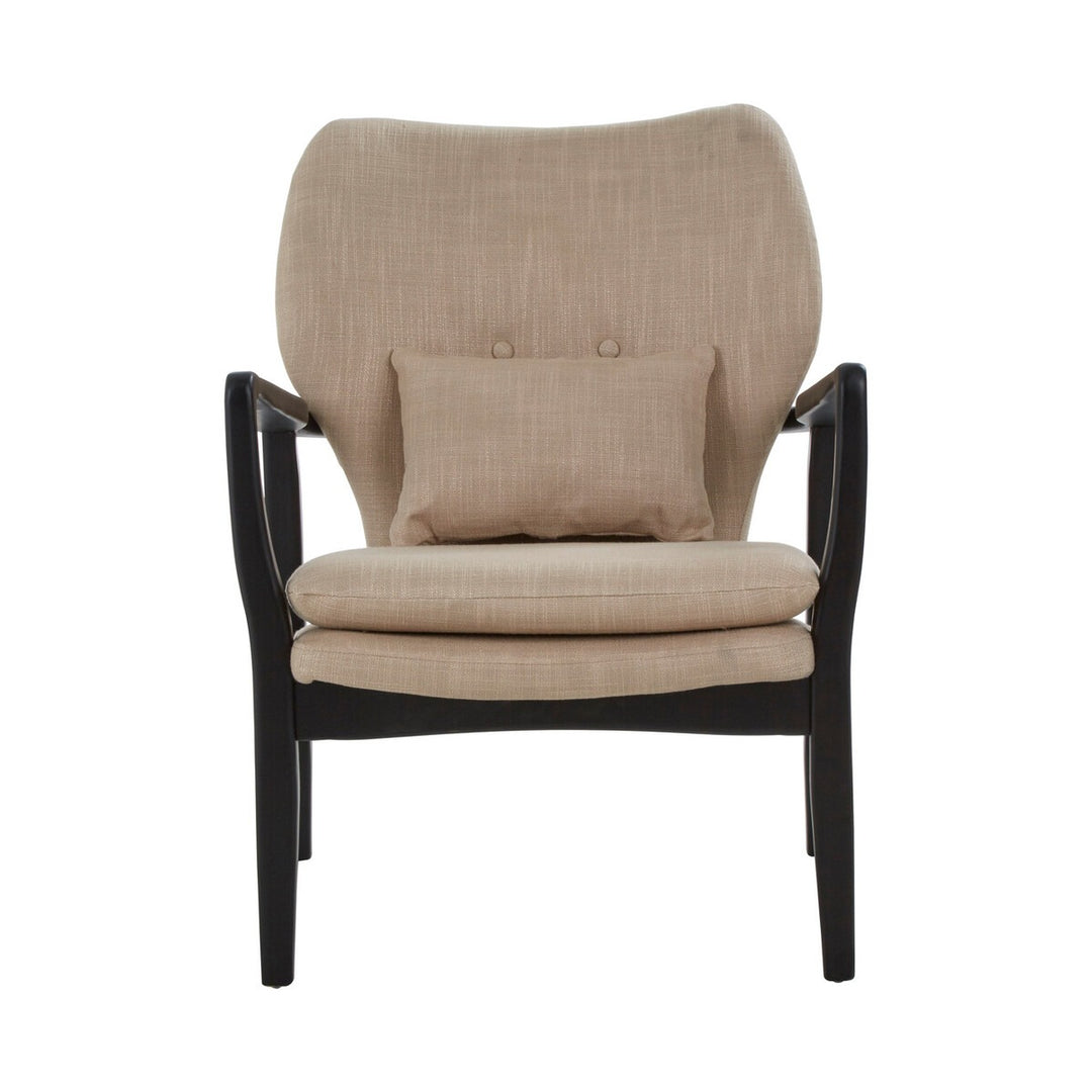The Stockholm lounge chair in beige linen fabric has strong angled arms, an elegant curved black wood frame and a cushioned high back seat the chair is styled further with button tufting its removable seat and back cushions add an extra layer of comfort perfect for your modern home.