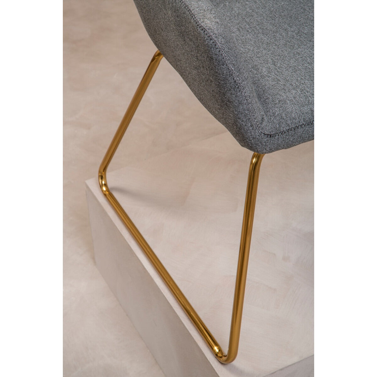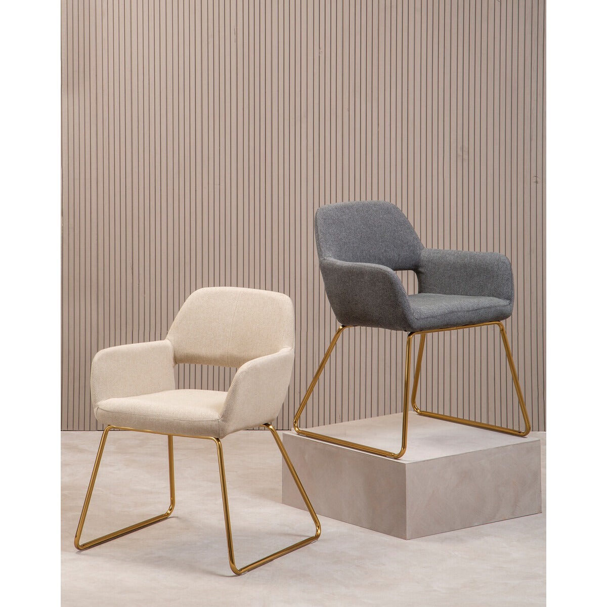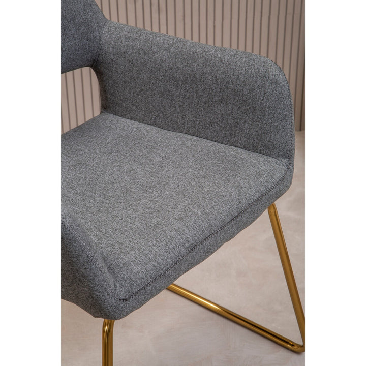 The Stockholm dining chair featuring a cut out design, this chair is crafted skilfully with grey fabric upholstery. The ergonomic armrests and foam padded seat of this chair provides comfort, and the sledge metal base in gold finish adds stability to the frame.
