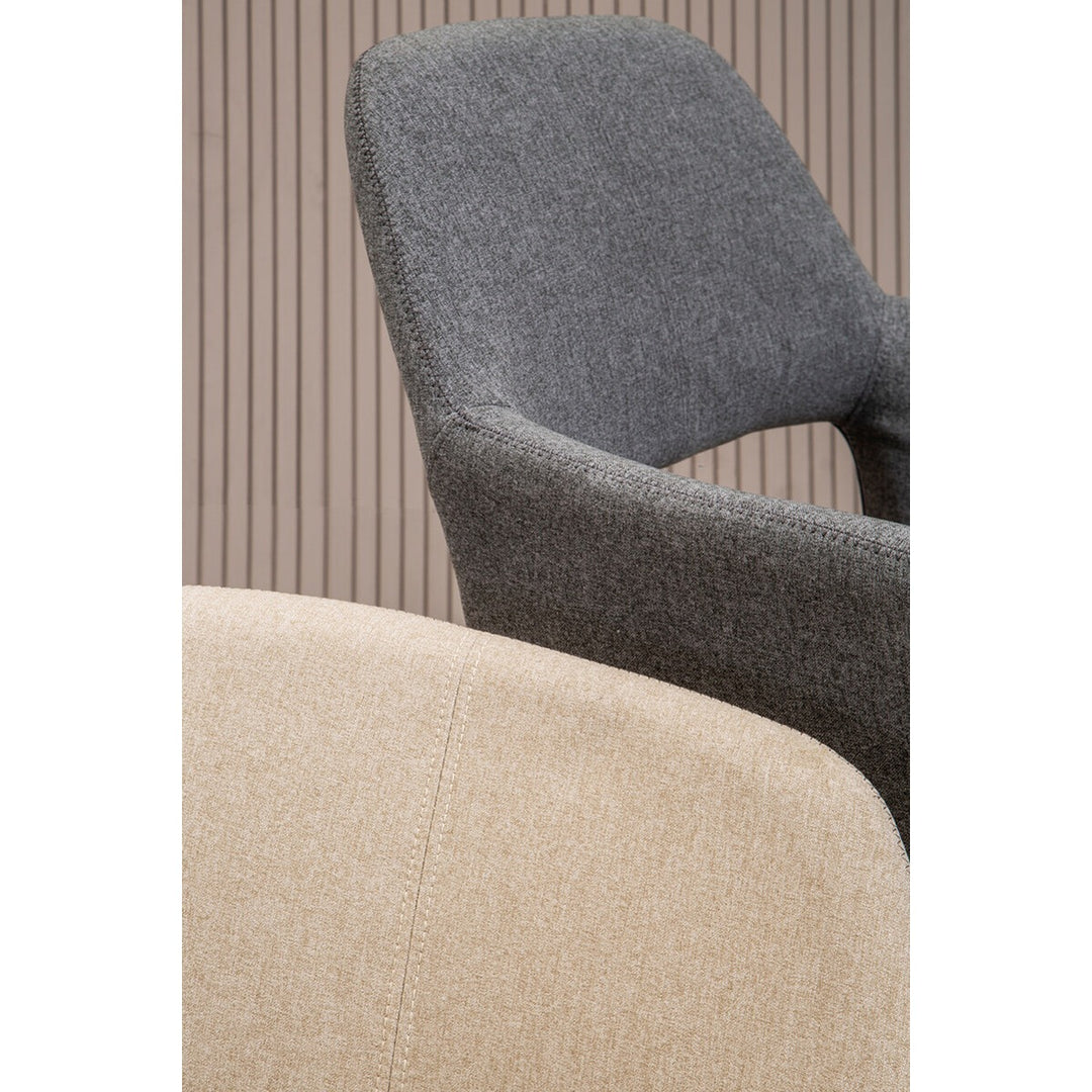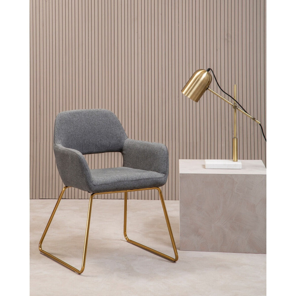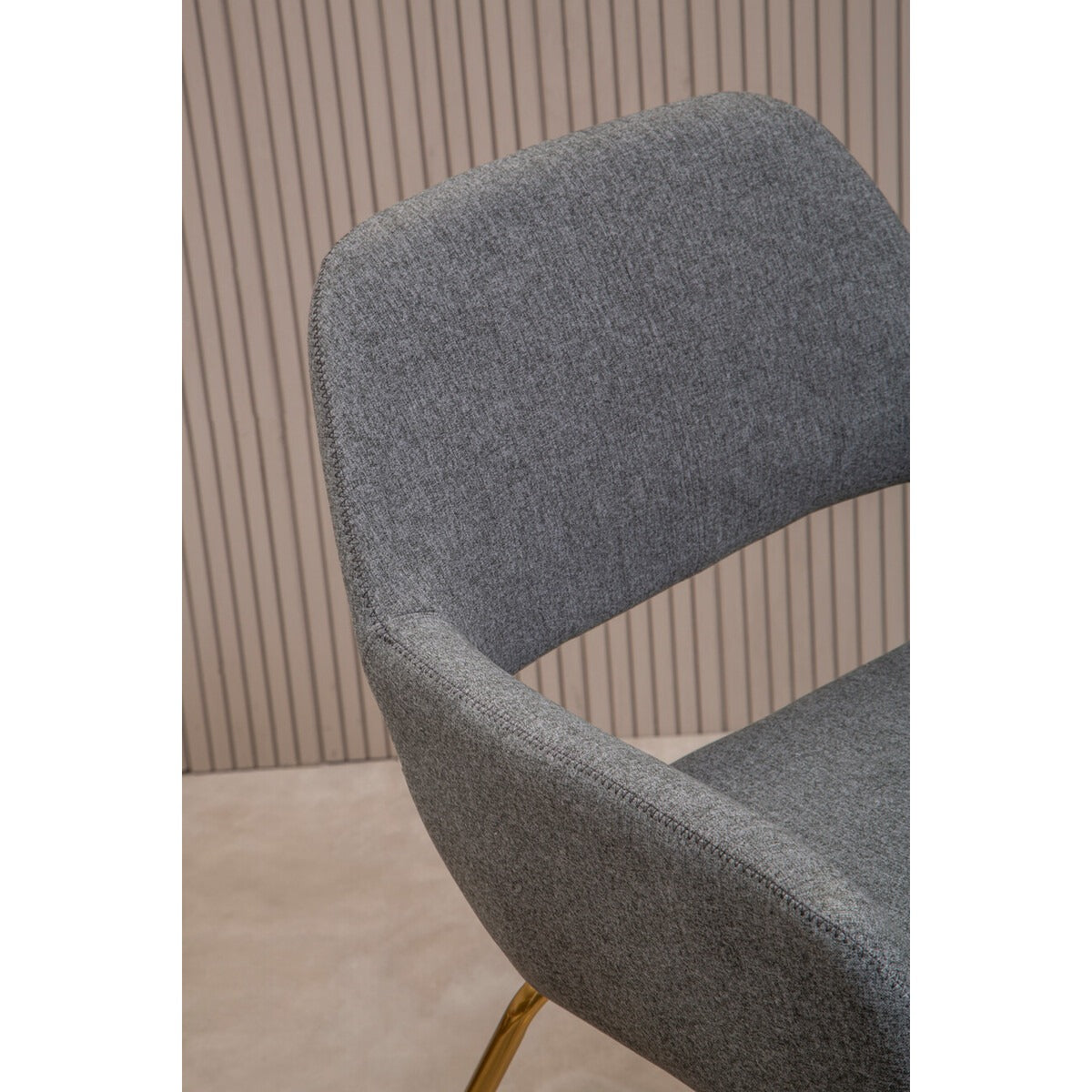The Stockholm dining chair featuring a cut out design, this chair is crafted skilfully with grey fabric upholstery. The ergonomic armrests and foam padded seat of this chair provides comfort, and the sledge metal base in gold finish adds stability to the frame.