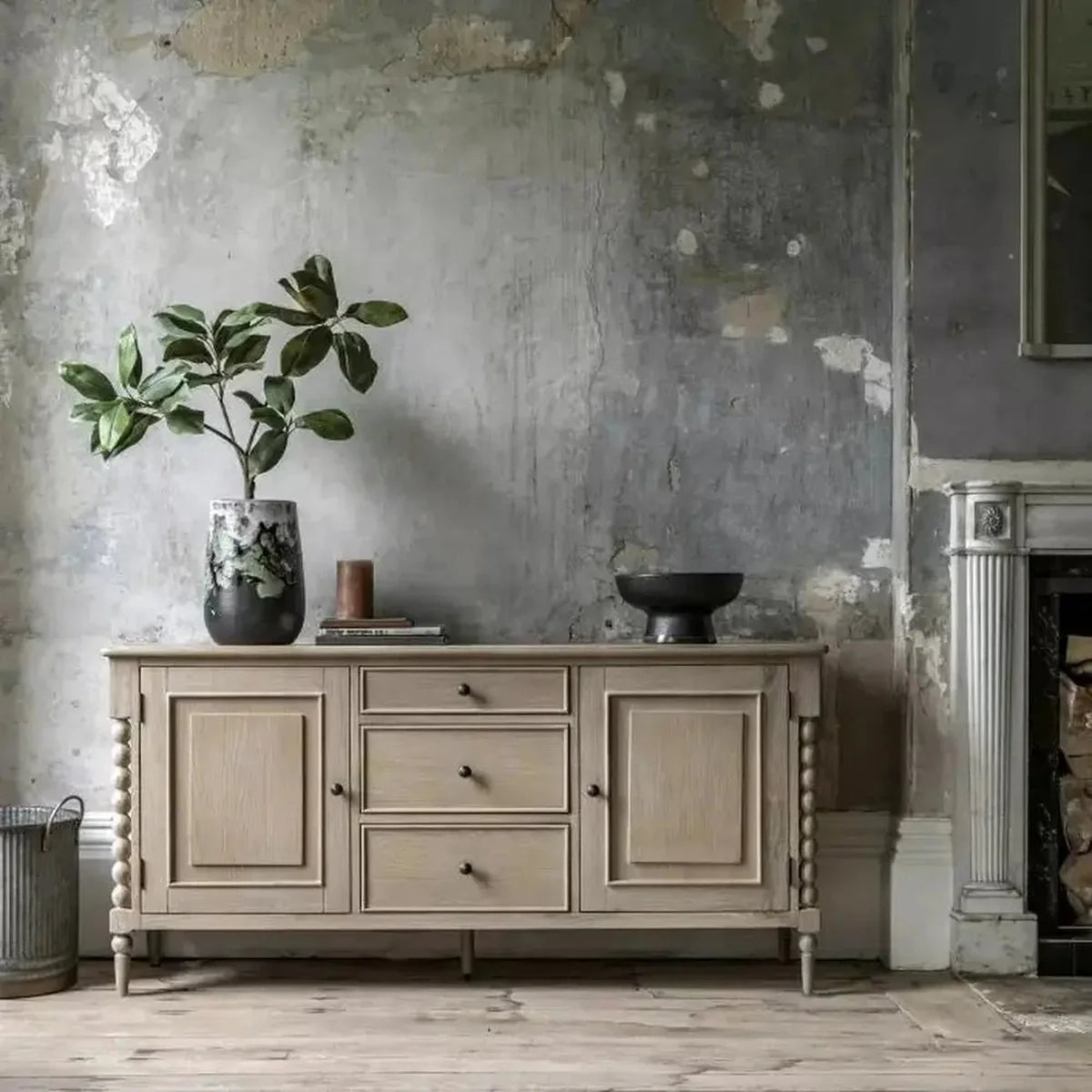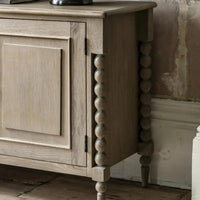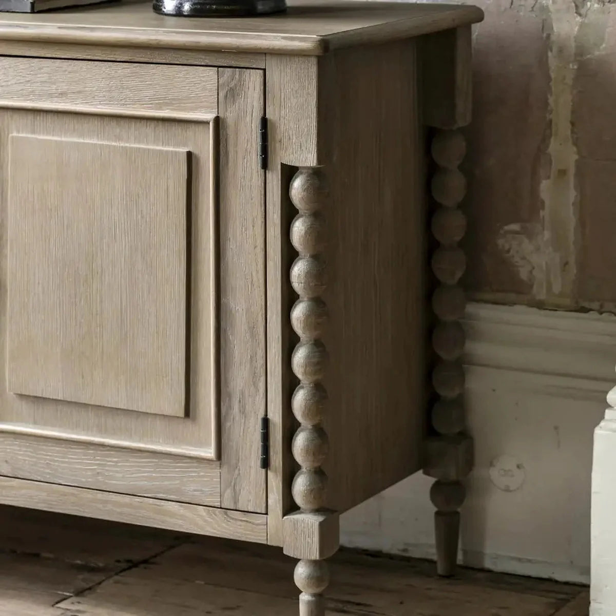 Offering practical storage combined with beautiful design, this stunning sideboard would make a stylish addition to any living or dining room. The play on a classic look emphasises the hand-crafted bobbin detail down each corner. This eye-catching design feature is created by turning the wood on a lathe, a task carried out by the finest craftsmen. The sideboard is made using beautiful oak solids and veneers where practical, with a very subtle lime wash tone to the finish which is soft and mellow. Matching pieces are available.